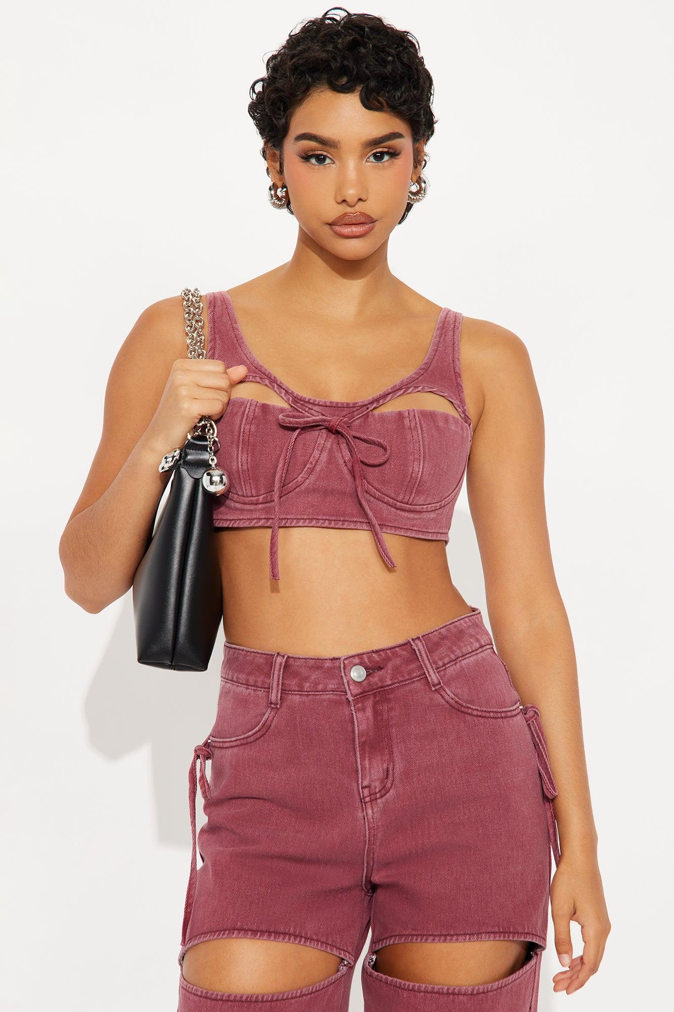 Available In Burgundy. Bra Top And Wide Leg Pant Set Non Stretch Regular 32" Inseam Pockets Button And Zipper Pant Closure Disclaimer Due To The Specialized Wash & Process, Each Garment Is Unique. 92% Cotton 8% Rayon Imported California Proposition 65WARNING: Cancer and Reproductive Harm - www.P65Warnings.ca.gov.