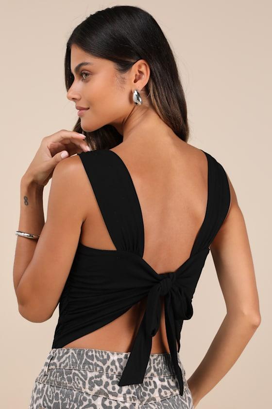 You'll be more than ready for the rising temps when you have the Lulus Cut Out for Summer Black Ruched Tie-Back Bodysuit! Stretchy jersey knit shapes this breezy bodysuit with a flattering scoop neckline supported by wide tank straps with gathered details. The fitted bodice features flattering ruching at the sides and boasts a tie-back design that creates a flirty back cutout. Attached thong bottoms have snap closures.
