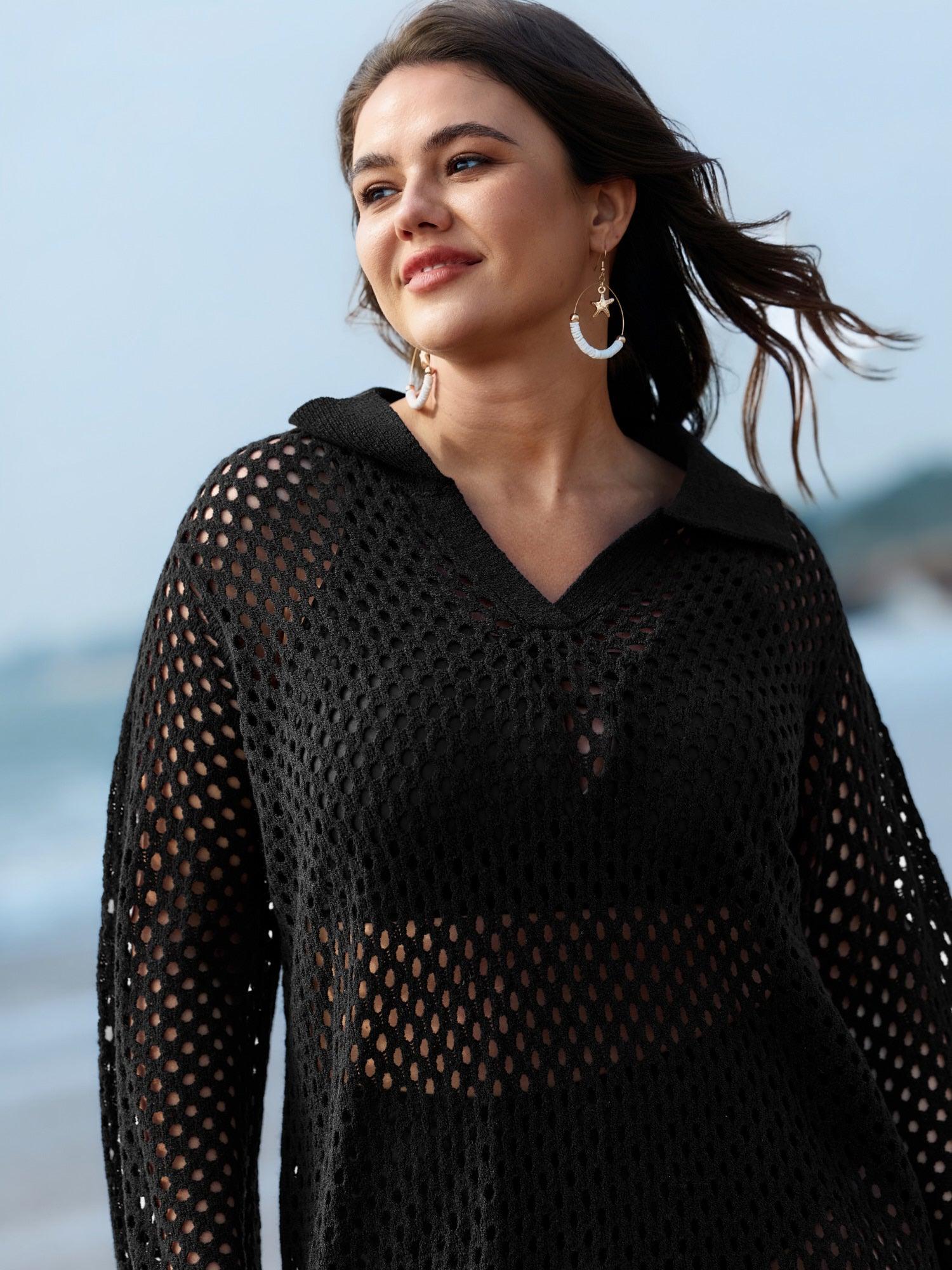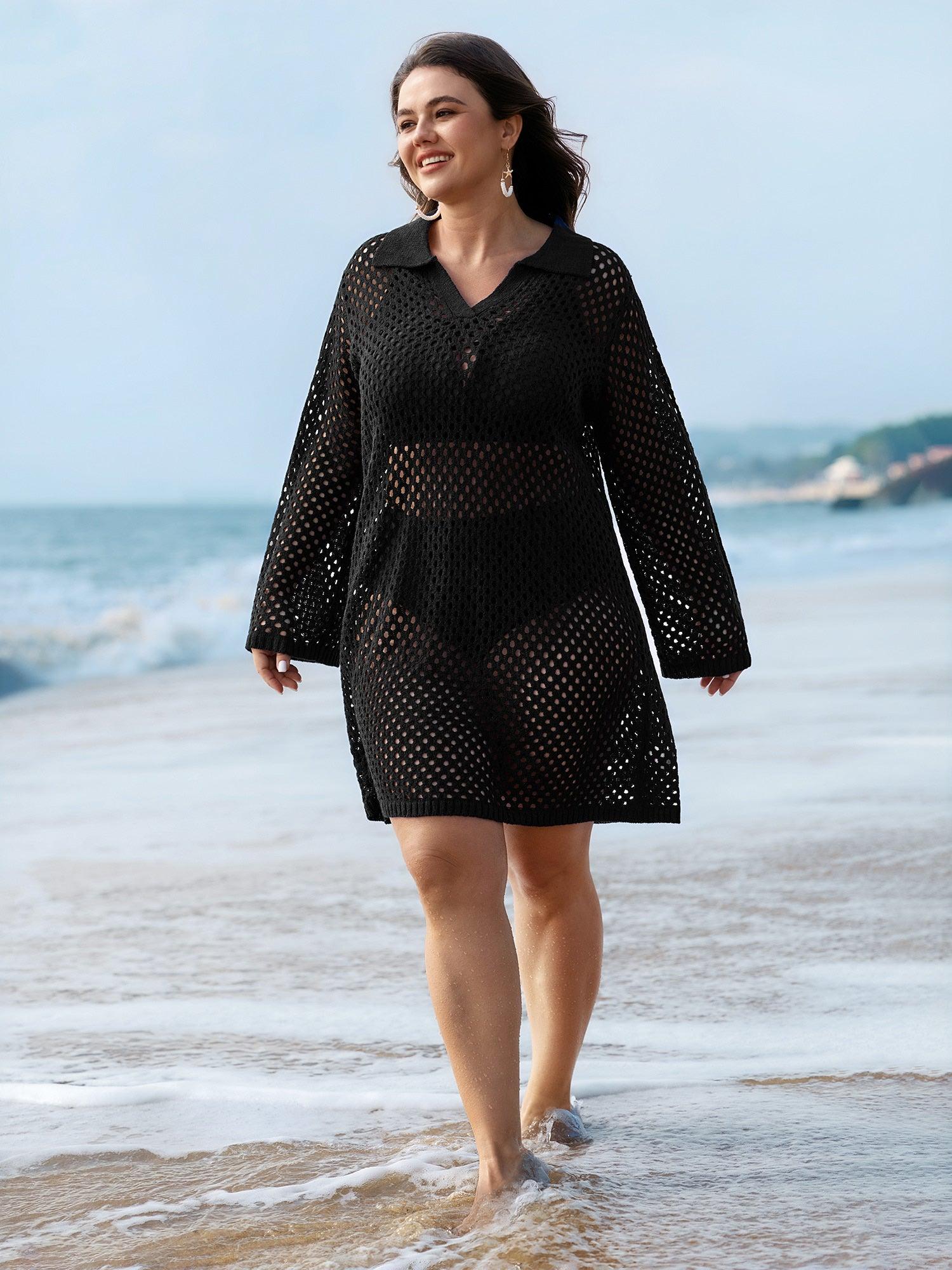 Shop Cut-Out Sheer Collar Swim Cover-Up now and redefine your style with confidence at BloomChic. Tailored for mid and plus-size women. This trendy Swimwear Women, sizes 10-30. Color:Black;Style:Leisure;Neckline:V-neck;Sleeve Type:Bell Sleeve;Prints:Non;Pocket:No-pocket;Belt:No-belt;Chest pad:No-chest pad;Lining:No-lining;Closure Type:Non;Swimsuit types:Pullover Cover-Ups
