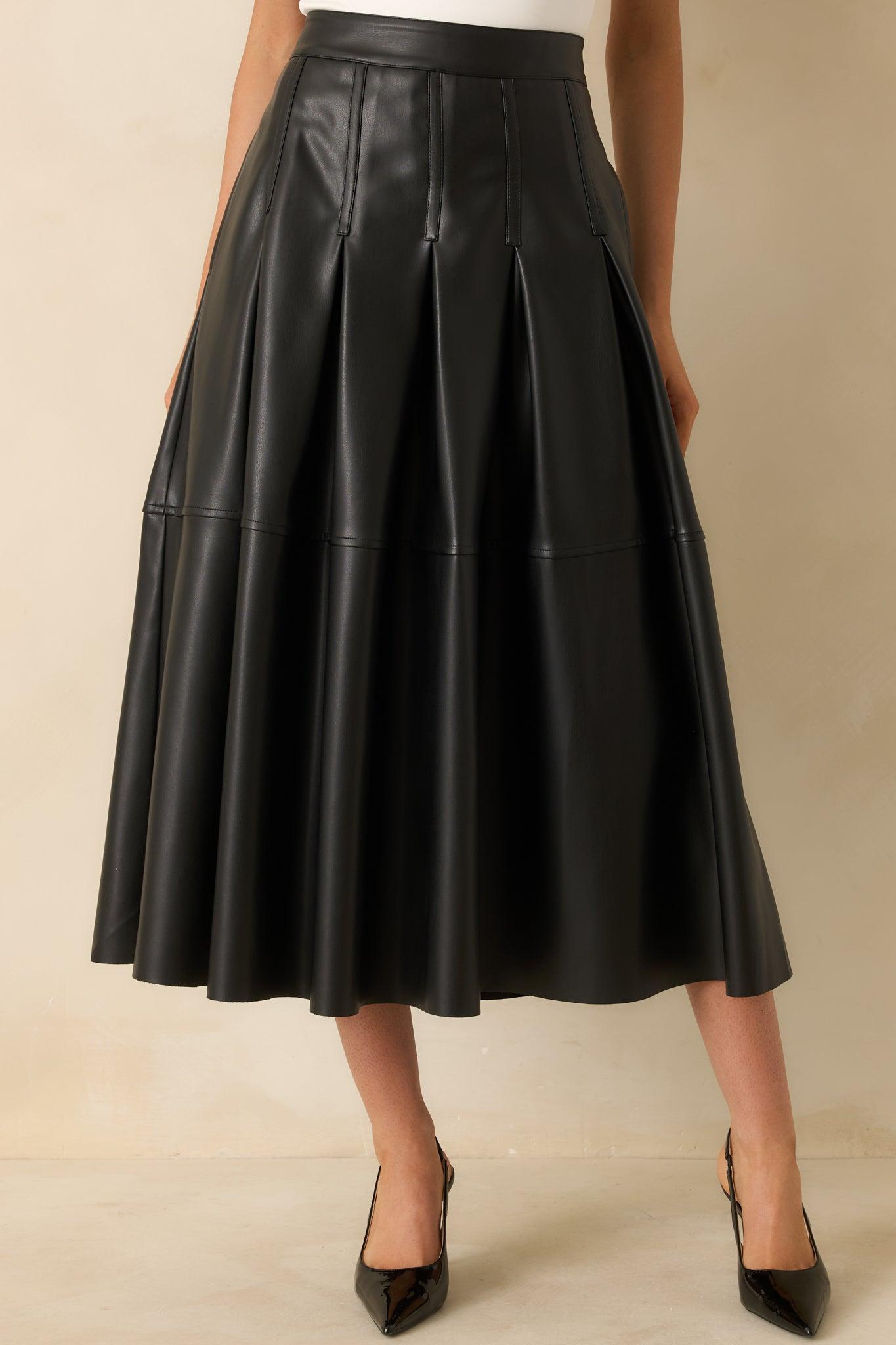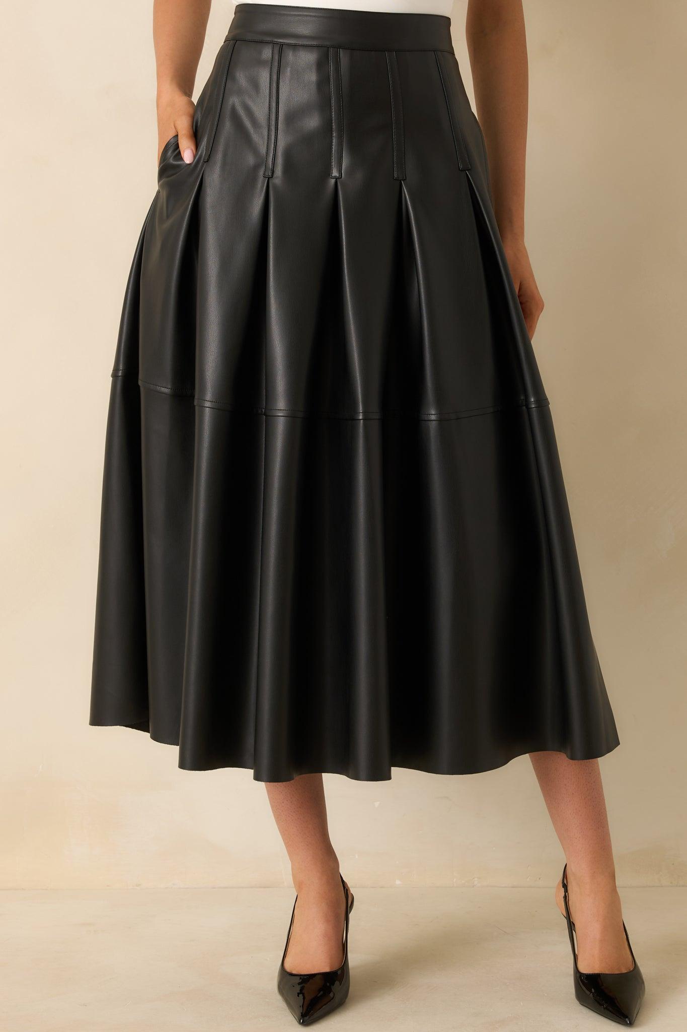 A skirt that does all the talking—sleek, sculpted, and ready to elevate anything you pair it with. The Cut To Perfection Black Faux Leather Pleated Midi Skirt brings a refined edge with soft structure and fluid movement, giving every step a little extra intention. Dress it up, tone it down, or make it the centerpiece of your outfit—it’s the kind of piece that transforms simple moments into stylish ones. This black faux leather midi skirt features structured vertical pleats through the waist, a smooth fitted waistband, and a full A-line silhouette with fluid movement. Designed with a soft inner lining and a side zipper closure for easy wear. 45% Polyurethane & 55% Polyester Lining: 100% Rayon Hand Wash Cold Manufactured in China Designed in the USA Model is 5'8" and wearing size small, clipped, model is a true x-small