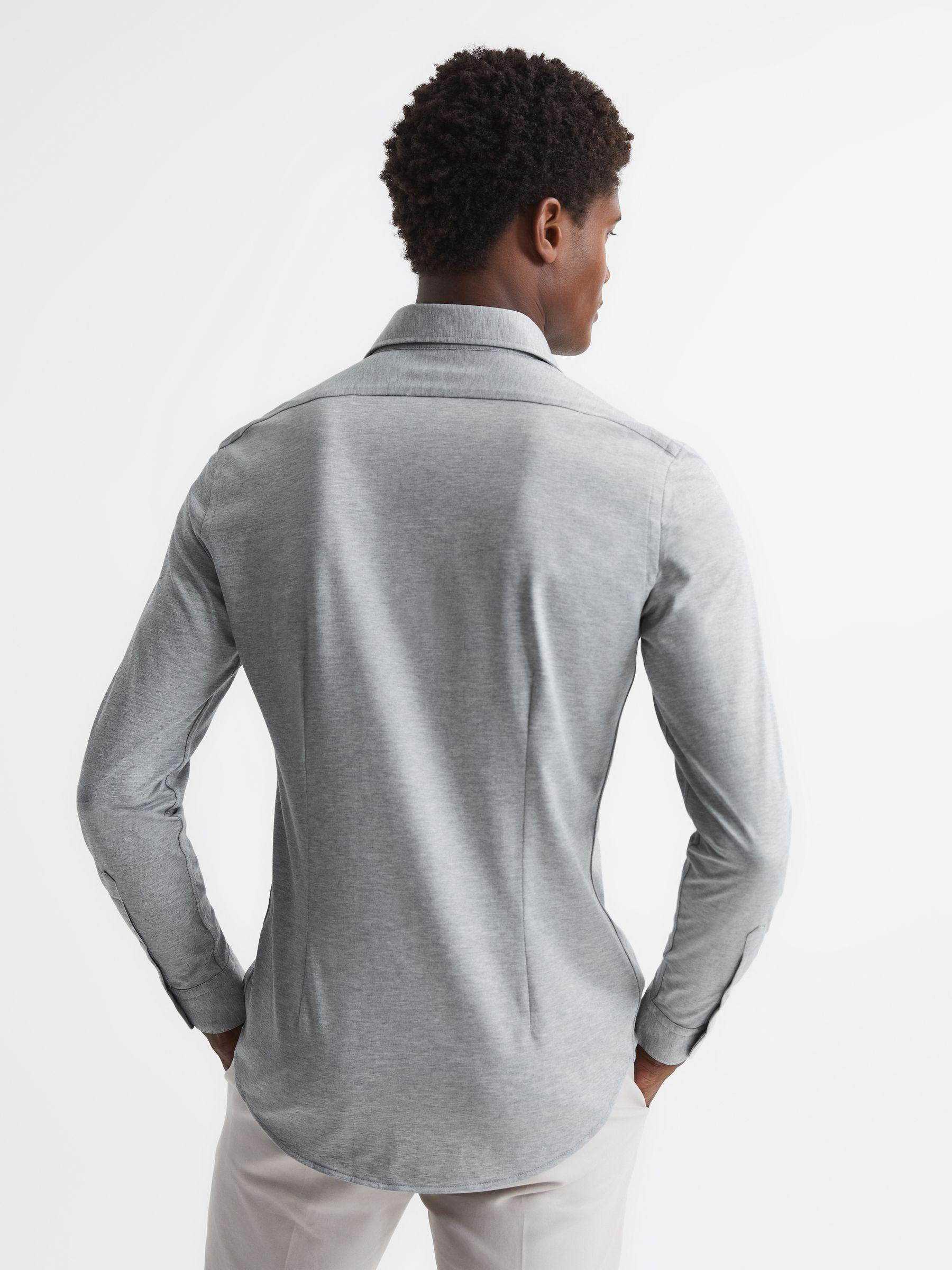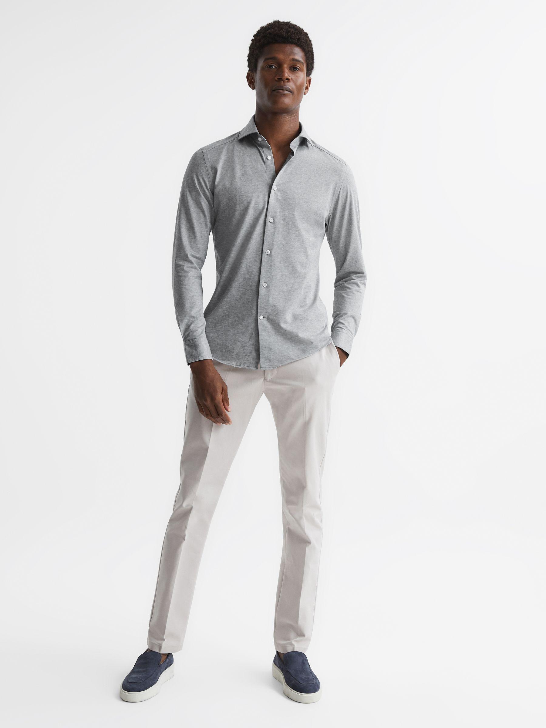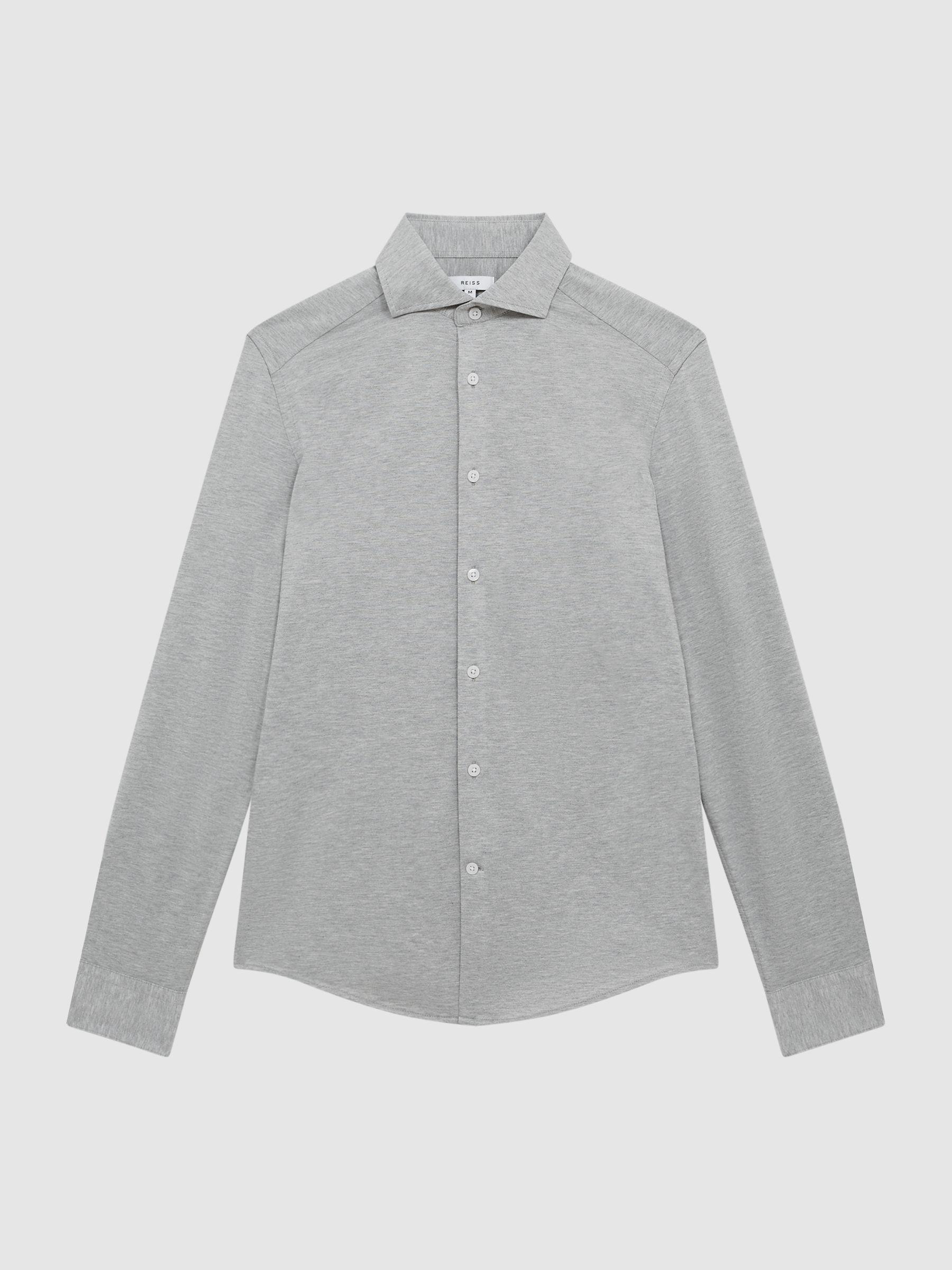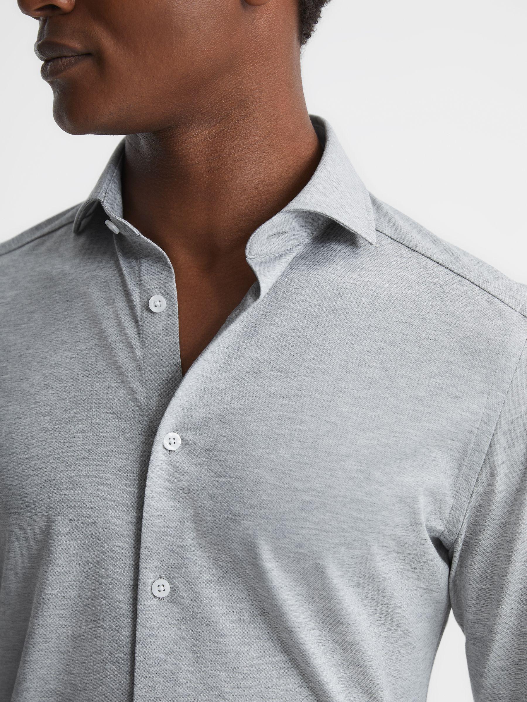 Steer your formal style into new territory with the slim-fitting Nate shirt in grey melange. It's crafted from a soft cotton jersey with a cutaway collar and a curved hemline. This style lends a relaxed feel to smart looks, for a versatile staple piece that can be paired with tailoring or more casual edits alike. Cutaway collar. Long sleeves. Button-through closure. Buttoned cuffs. Curved hemline. Slim fit. The model is wearing a size M. Measurements of model: Height 6ft 2.5 / 189cm.