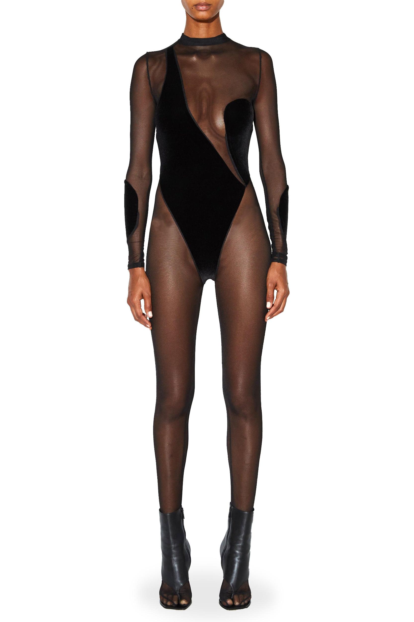 LaQuan Smith's signature catsuit is designed with velvet paneling that covers the arms, bodice, and inner legs. Sheer mesh panels cover the rest, with a high neck and zipped hems along with a zipper in the back.