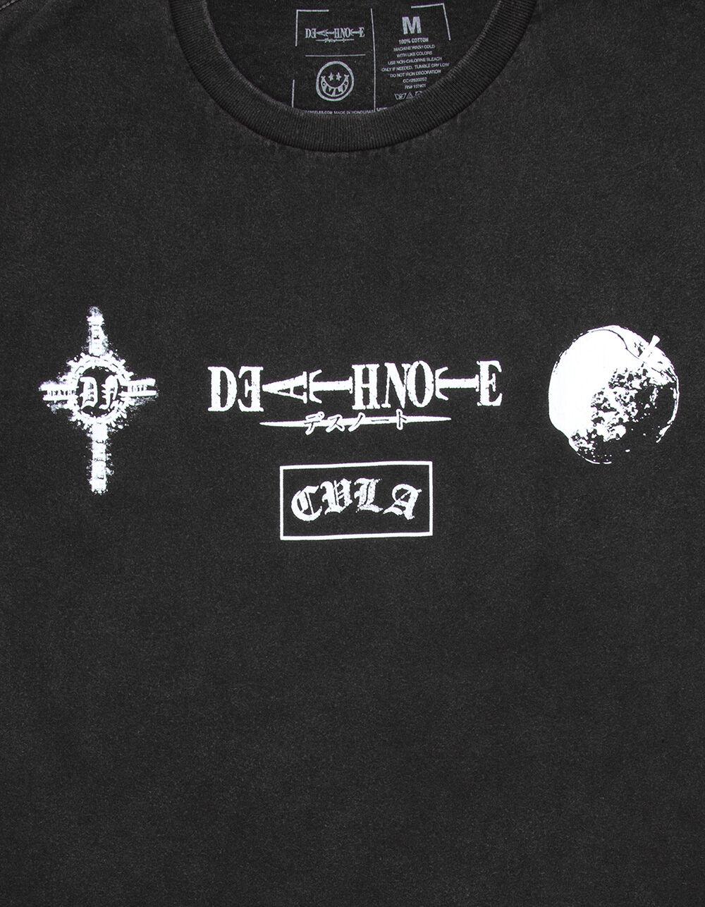 CVLA x Death Note Tee. Graphics screened at chest. Large graphic on back. The deep rich color of this product is achieved by using special dyes that create a variation in colors, making each item one of a kind. Crew neck. Short sleeve. 100% Cotton. Machine wash. Imported.