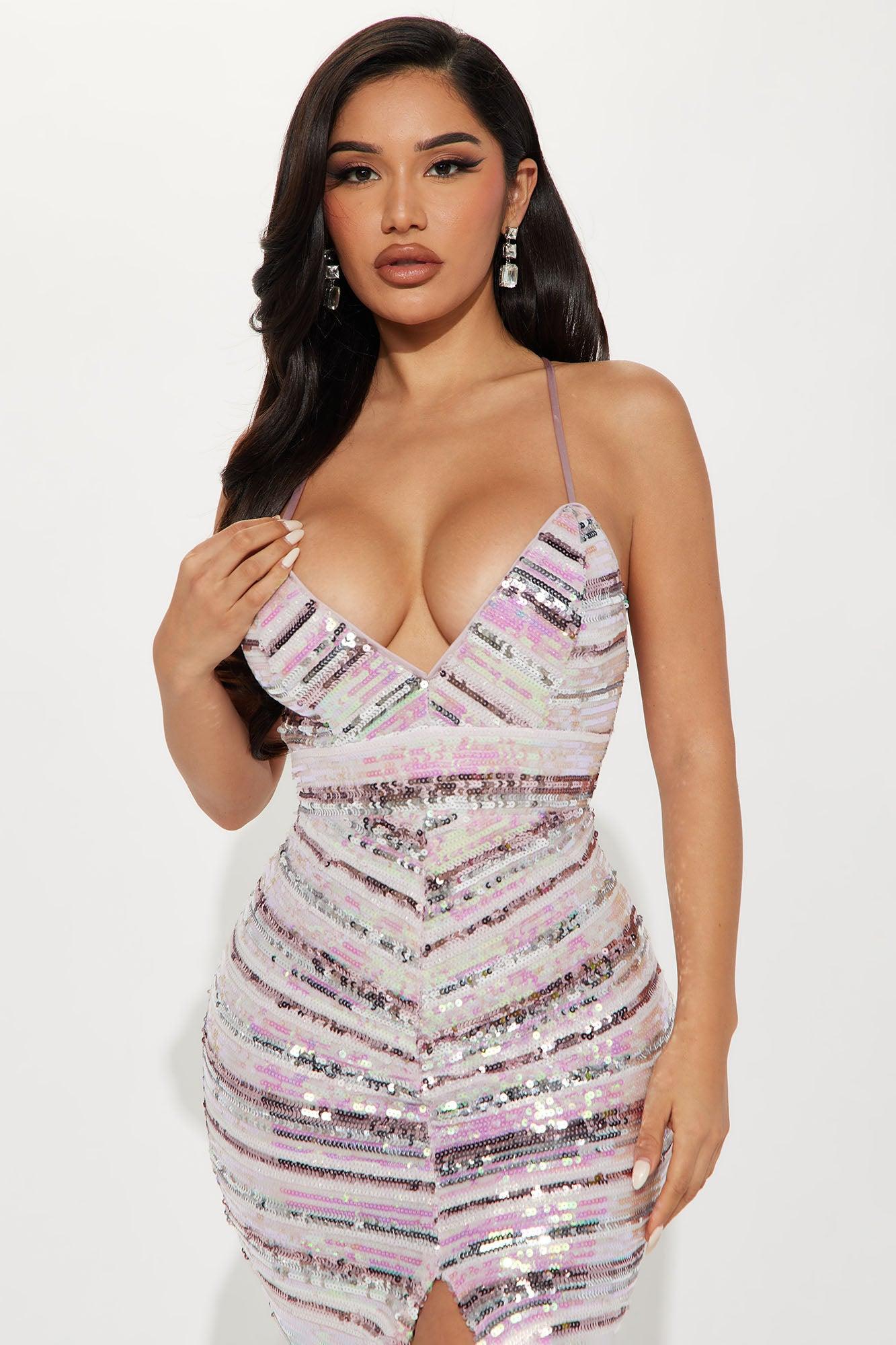 Available In Mauve/combo. Sequin Maxi Dress Adjustable Spaghetti Straps V-Neckline Padded Bra Cups High Slit Lace Up Back Back Zipper Lined Stretch Self: 50% PET 45% Polyester 5% Spandex Contrast: 95% Polyester 5% Spandex Lining 100% Polyester Imported