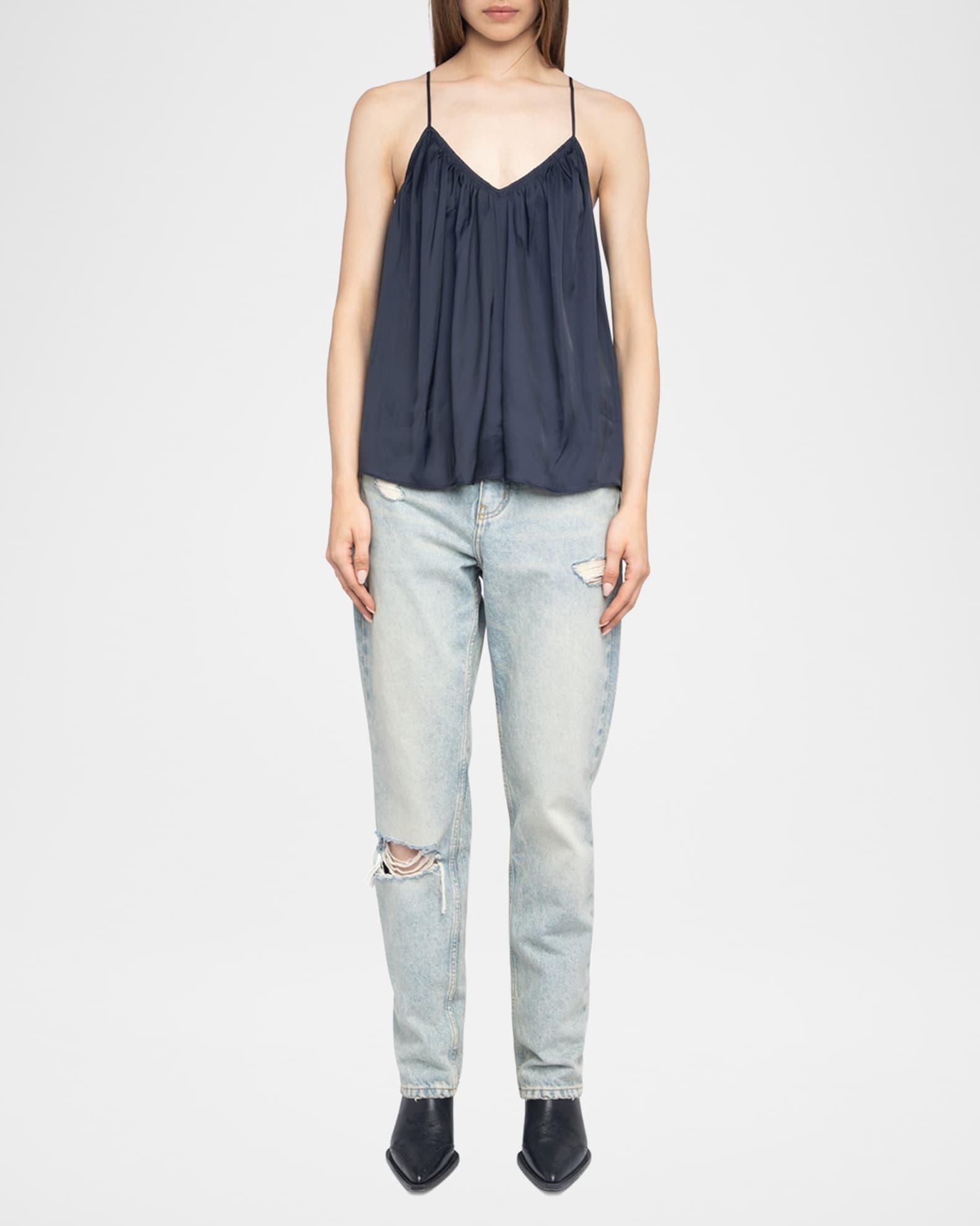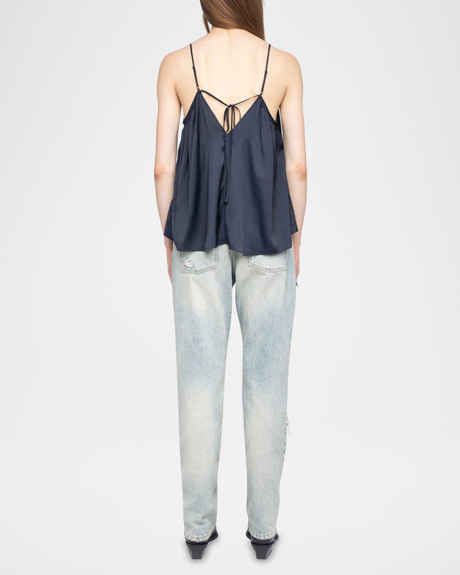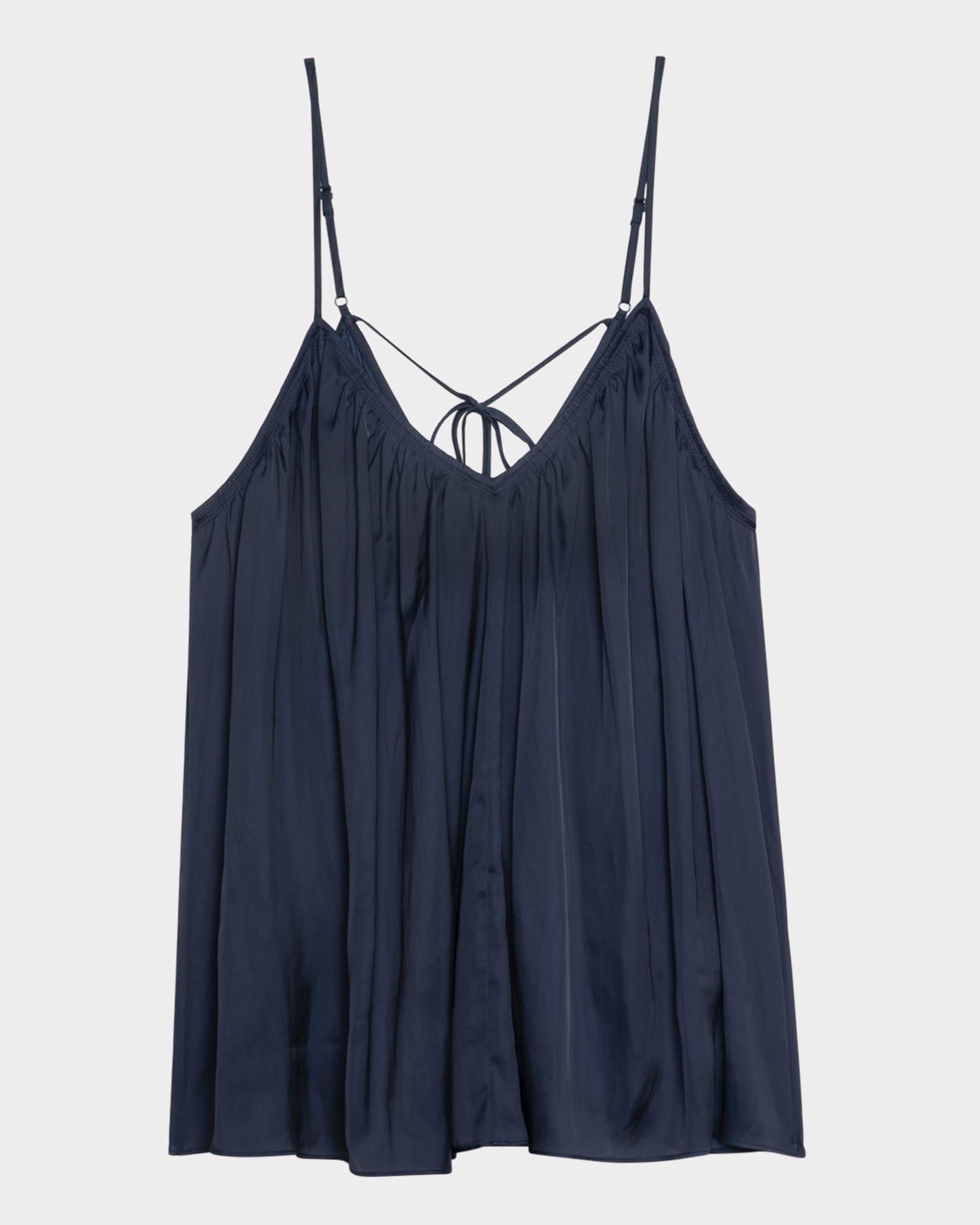Crafted from Japanese satin, the Cym tank top by Zadig & Voltaire is finished with subtle pleating V neckline Sleeveless Mid-back self-ties Relaxed fit Hip length Slipover style Cotton/polyester Machine wash cold, line dry Imported