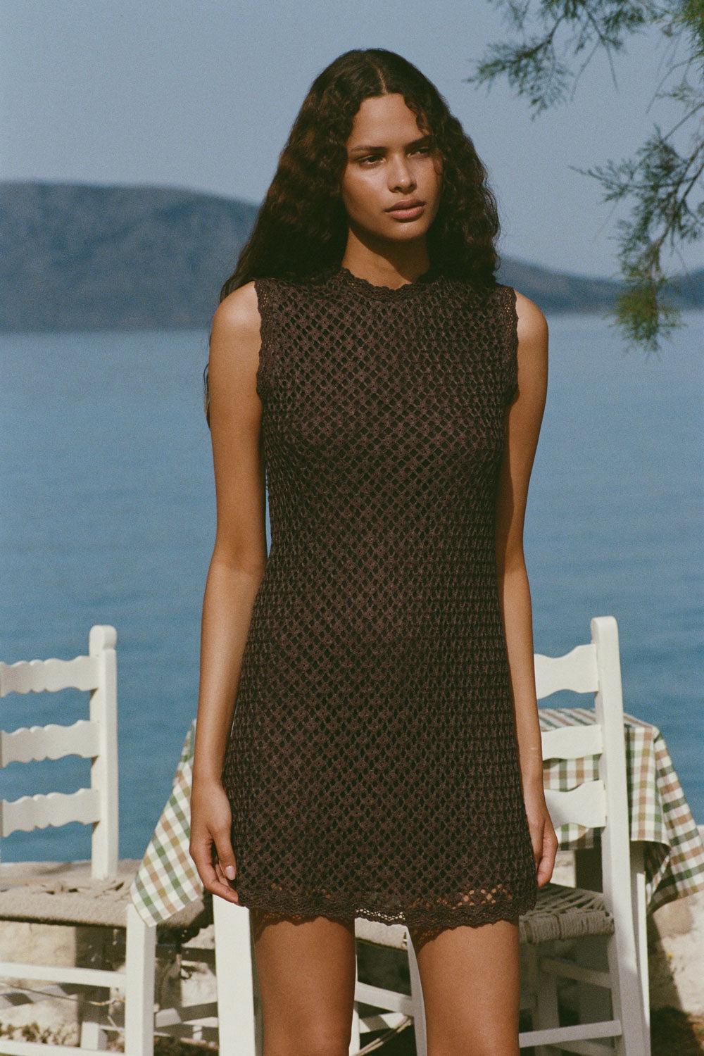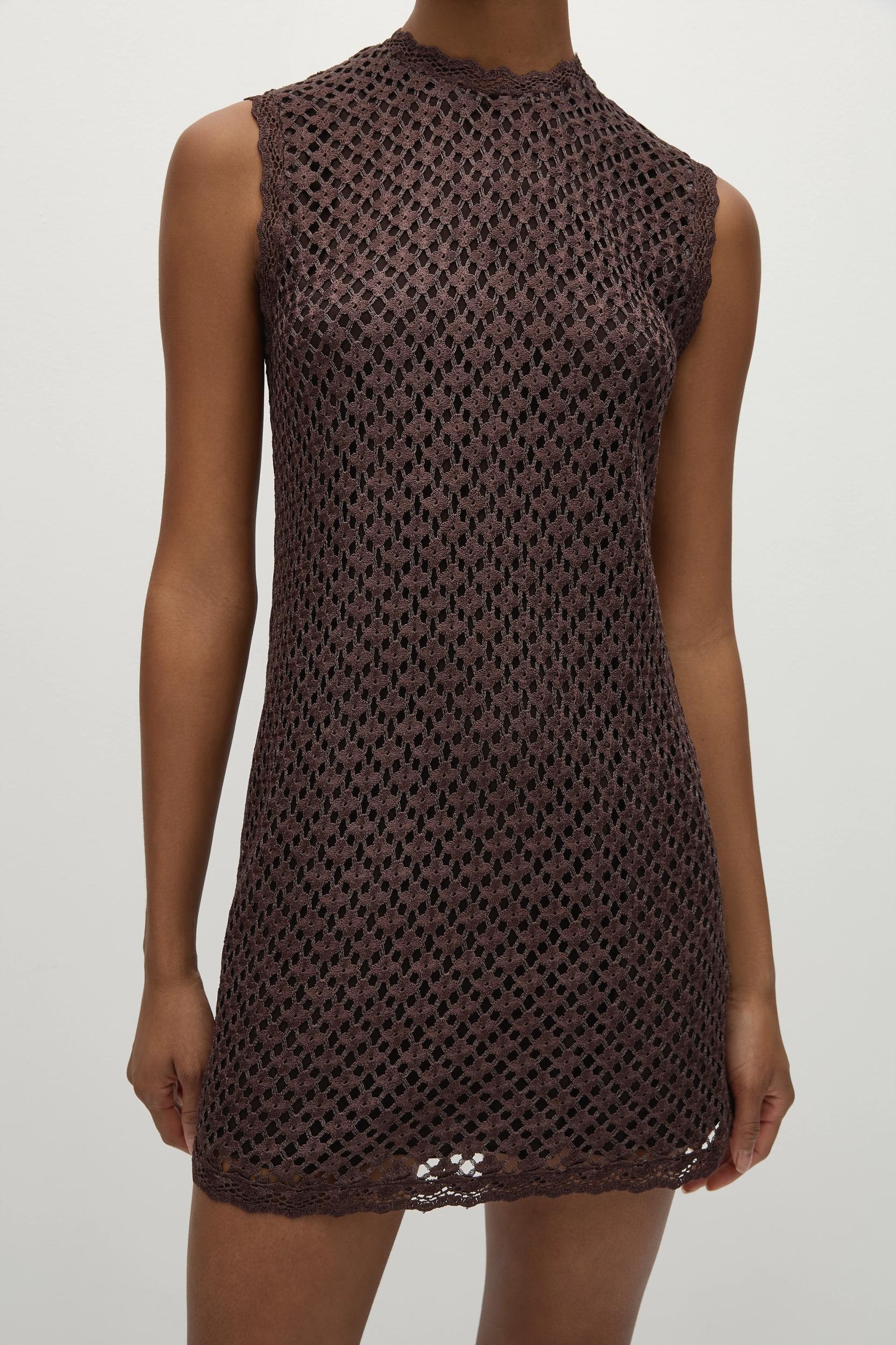 A vintage-inspired sleeveless mini dress, designed from a unique spectre lace fabrication, blending viscose and a signature 100% organic cotton, in a chocolate brown hue. With a high neckline and semi-fitted silhouette that falls effortlessly on the body, it features delicate scalloped edge details around the neckline, arms and hem. Style with a simple heel for summer occasionwear. This style is true to size. There is no elastic woven into the fabric so it does not offer any additional stretch.