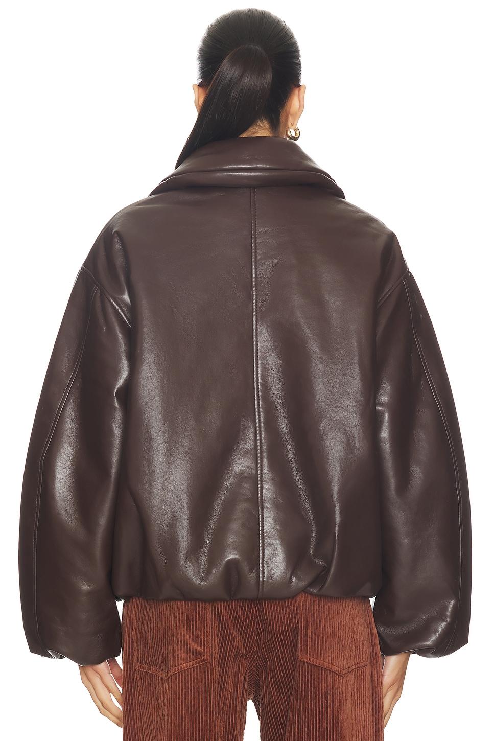 Self: 48% leather, 27% polyurethane, 25% polyesterLining: 57% polyetser, 43% viscose. Made in China. Dry clean only. Zip up closure. Side seam pockets. Cropped puffer. Turtleneck with snap button closure. Revolve Style No. ANIN-WO229. Manufacturer Style No. A-01-11561-BWN43.