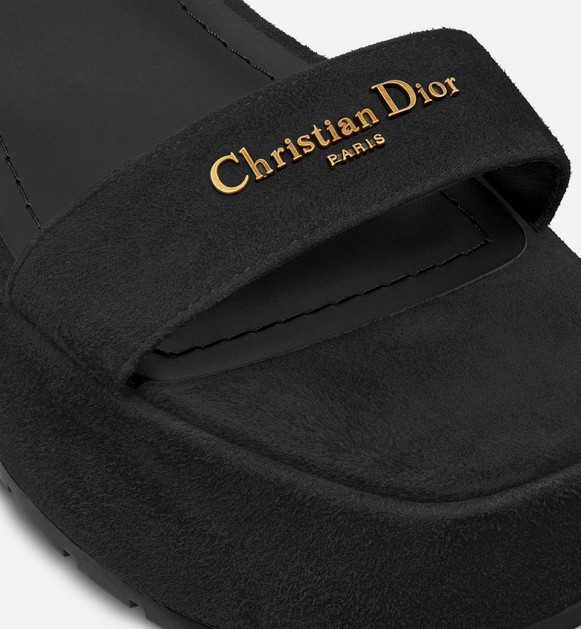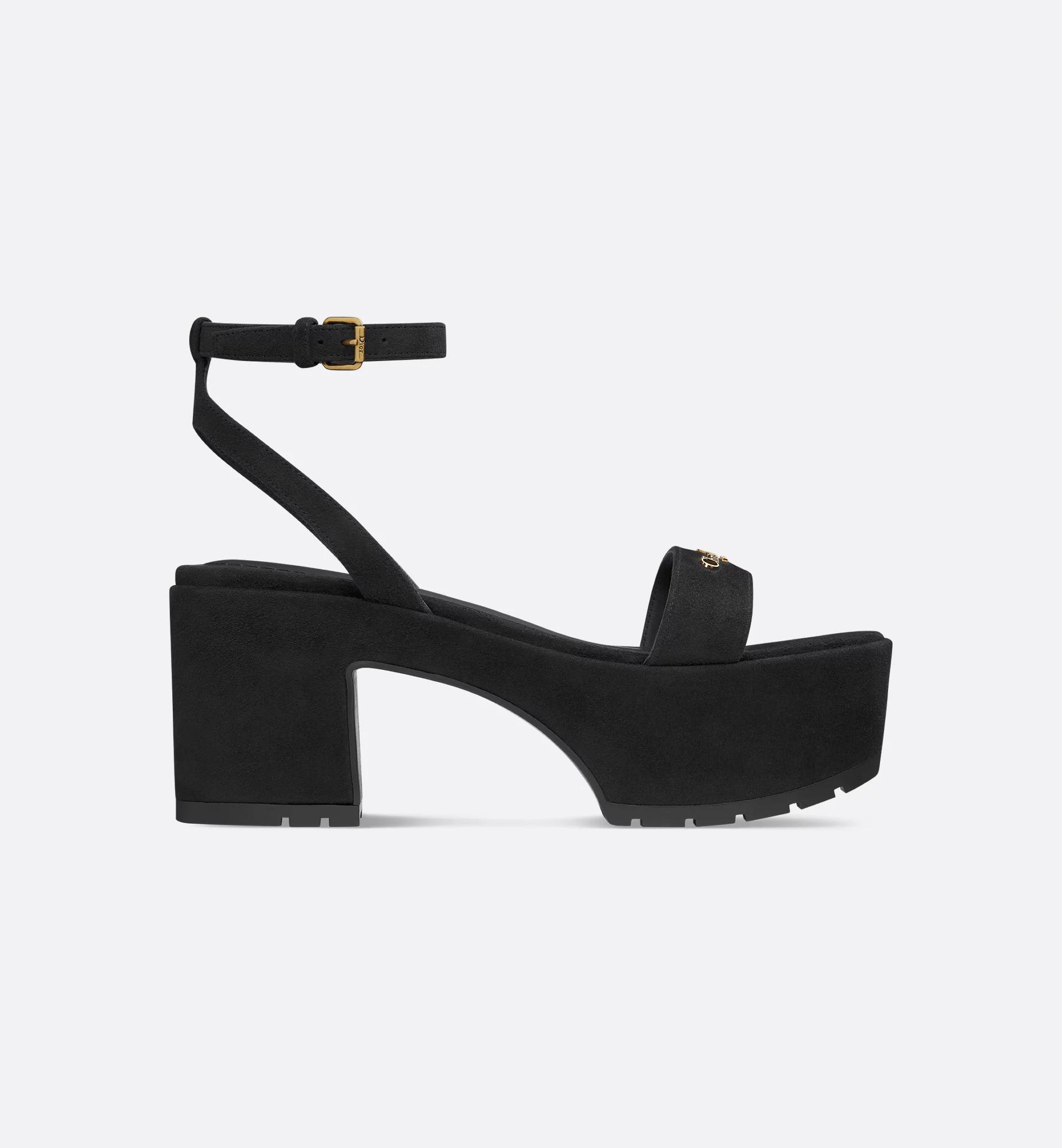 The D-Lane platform sandal is a modern and refined creation. The black suede goatskin upper is adorned with a gold-finish metal Christian Dior Paris signature for an instantly recognizable touch, while an adjustable buckled strap delicately highlights the ankle. The 7.5-cm (3-inch) block heel will add elegant flair to this season's looks. Main composition: suede goatskin. Calfskin lining. Gold-finish metal Christian Dior Paris signature on the upper. Adjustable buckled ankle strap. TPU insole. Platform and thin rubber sole with engraved star, Christian Dior's lucky symbol. Made in Italy