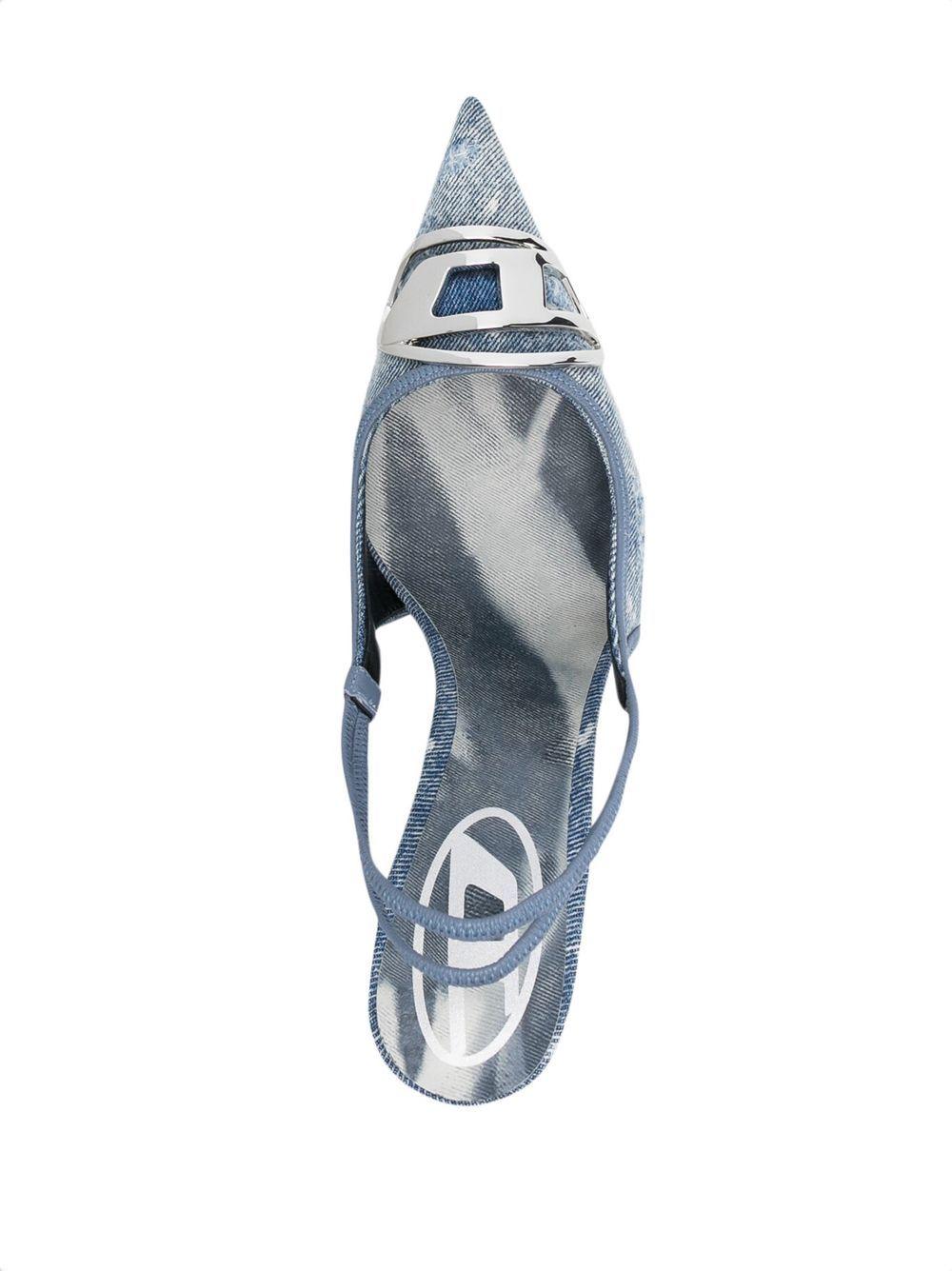 Diesel D-Venus 80mm denim slingback pumps | Blue | indigo blue | cotton | oversized signature D logo | buckle detail at the toe | distressed finish | pointed toe | stiletto heel | elasticated slingback strap | Leather | Heeled Pumps | Pumps | Shoes | Women