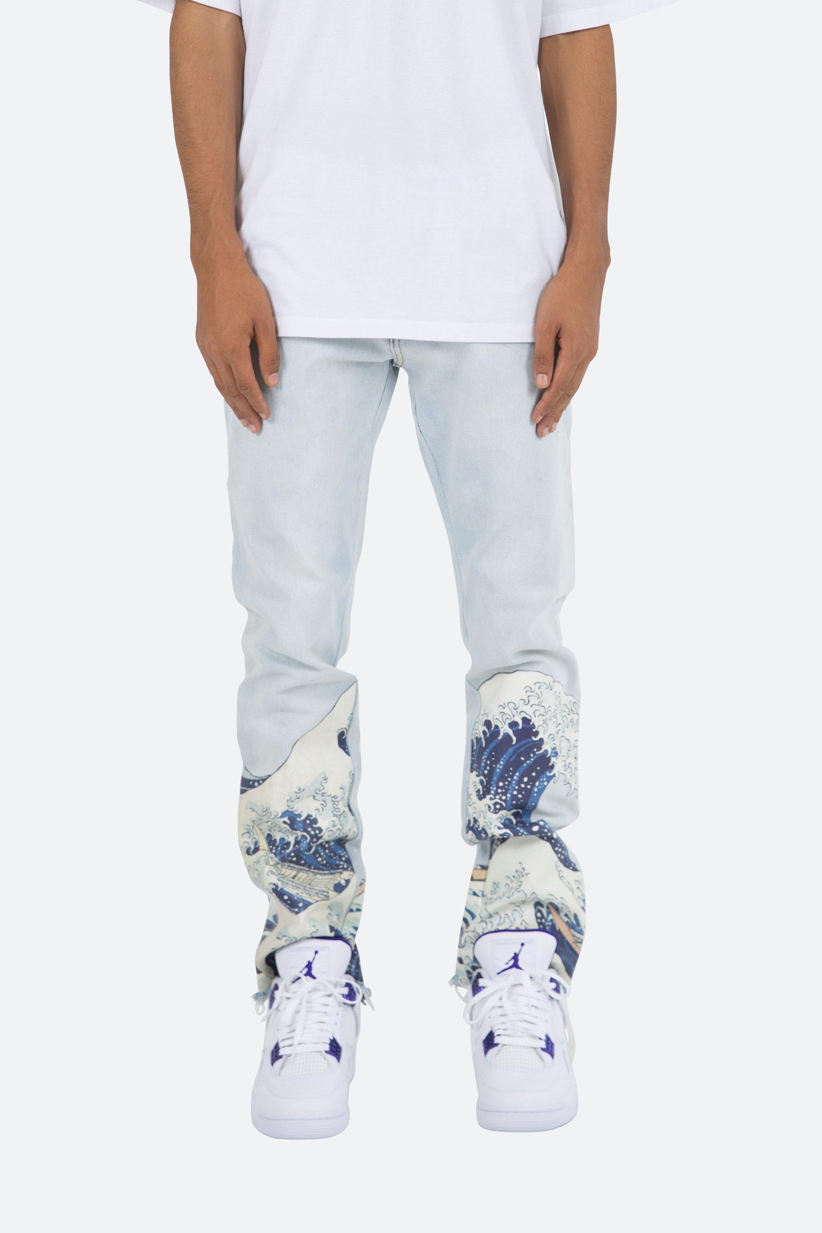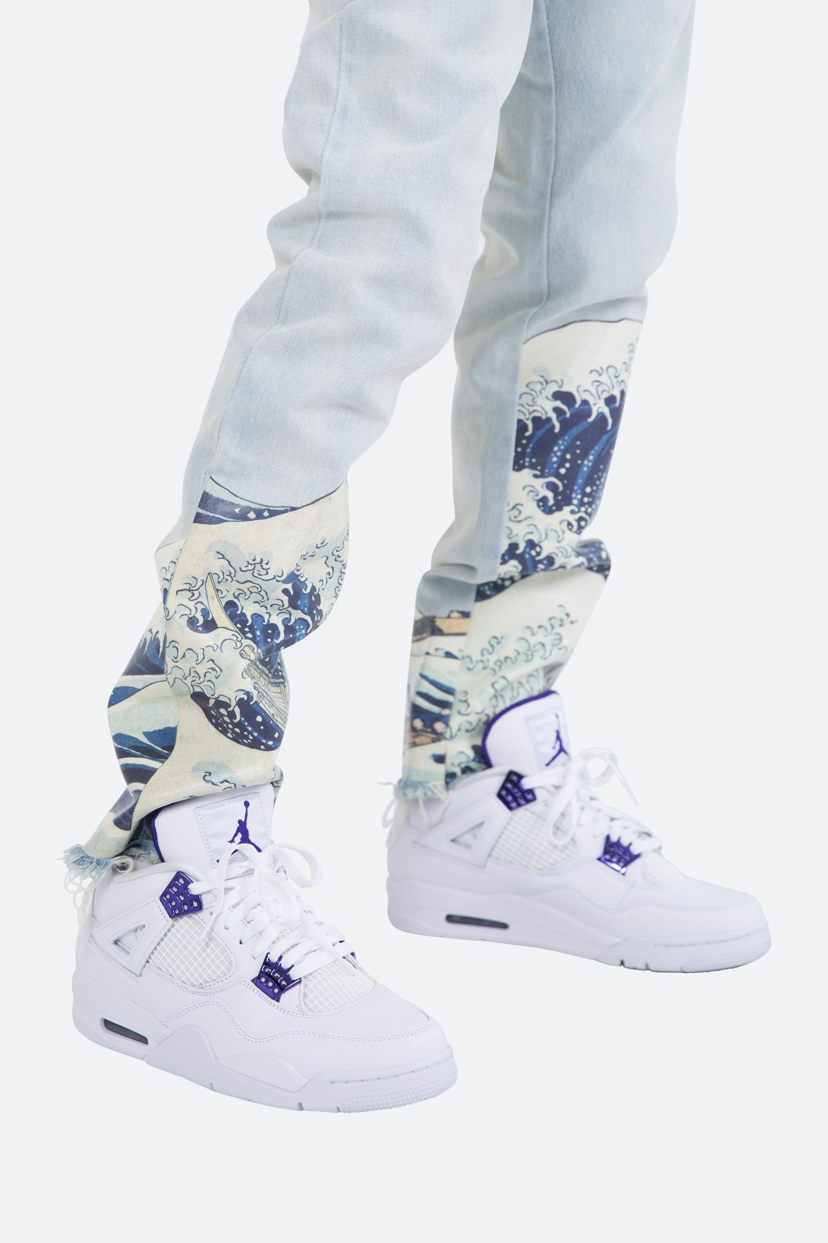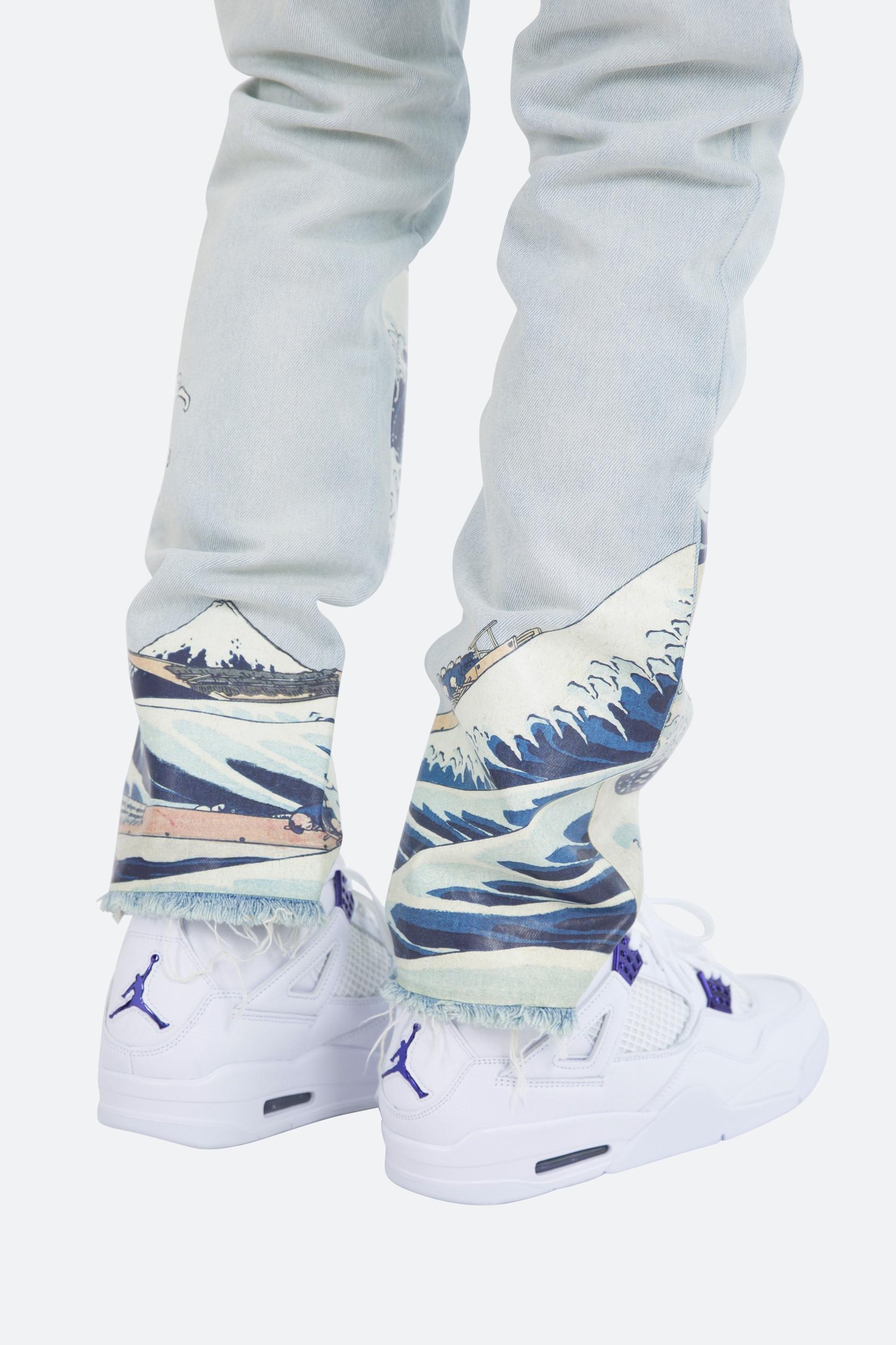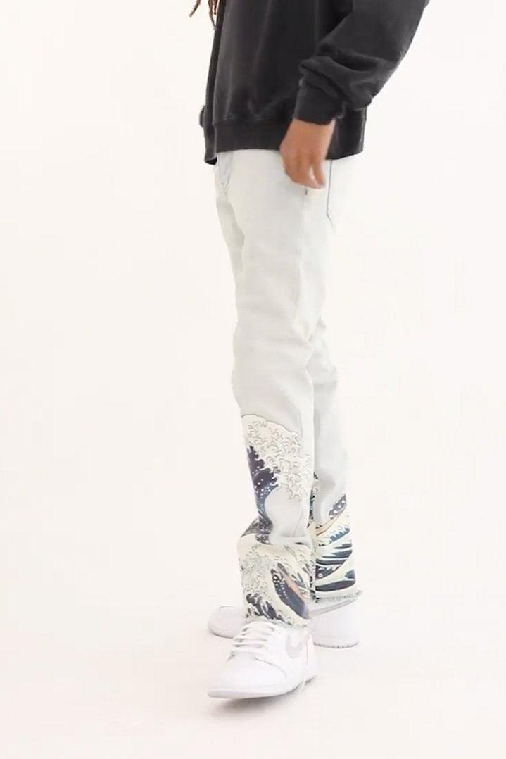 the D233 Wave Denim is designed with our new D fit which is relaxed throughout with an extended inseam for stacking and full color wave heat press artwork at the leg opening and finished with an unconstructed hem. details relaxed fit throughout* 100% cotton extended inseam model is 6’1, 140 lbs and wears a size 30 *not