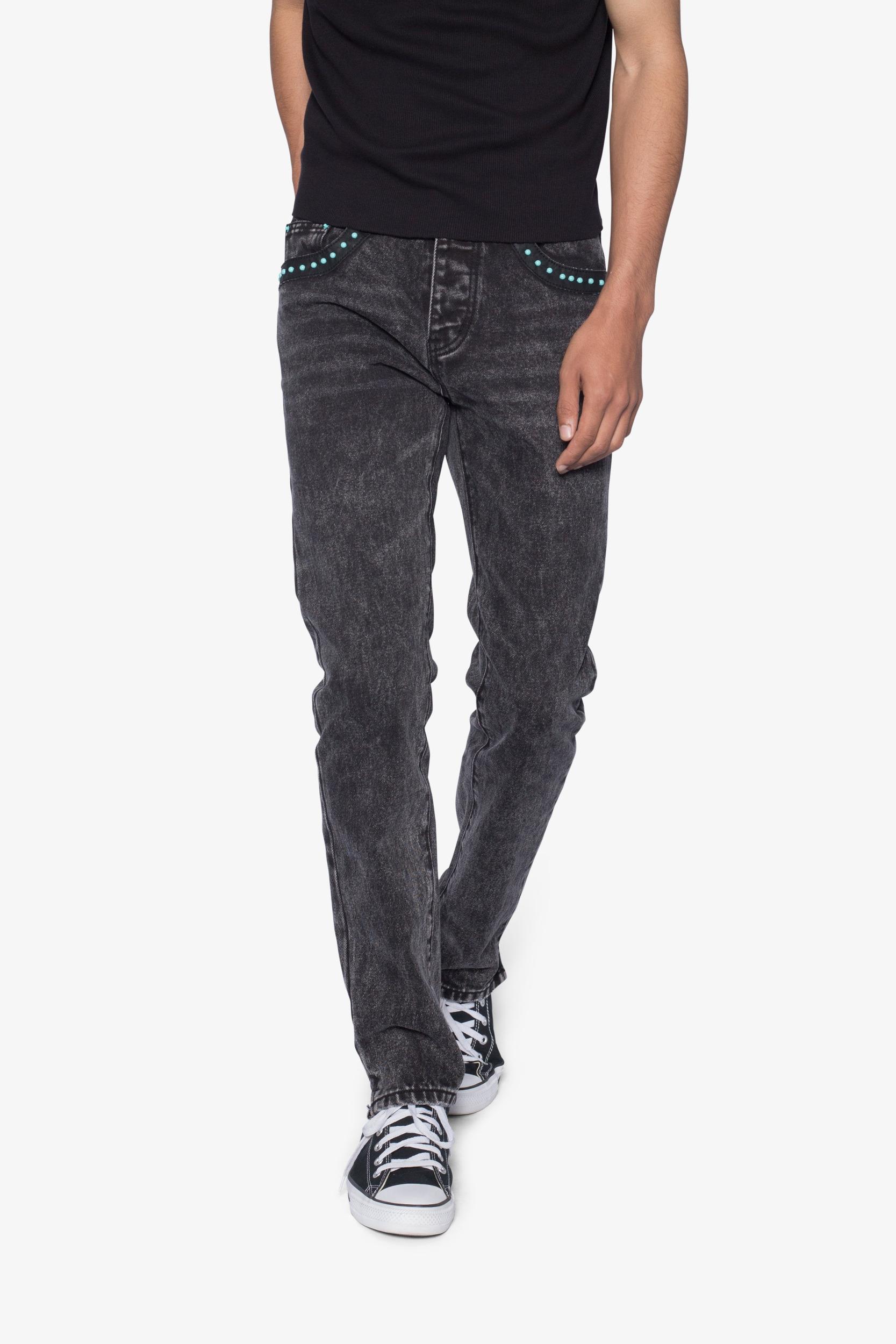 the D701 Studded Turquoise Denim is designed with our new D fit which is relaxed throughout with an extended inseam for stacking and features a stone black based wash, blended fabrication for style and comfort, tonal whiskering, eye-catching turquoise studding along the pockets, and a minor hem split at the leg opening