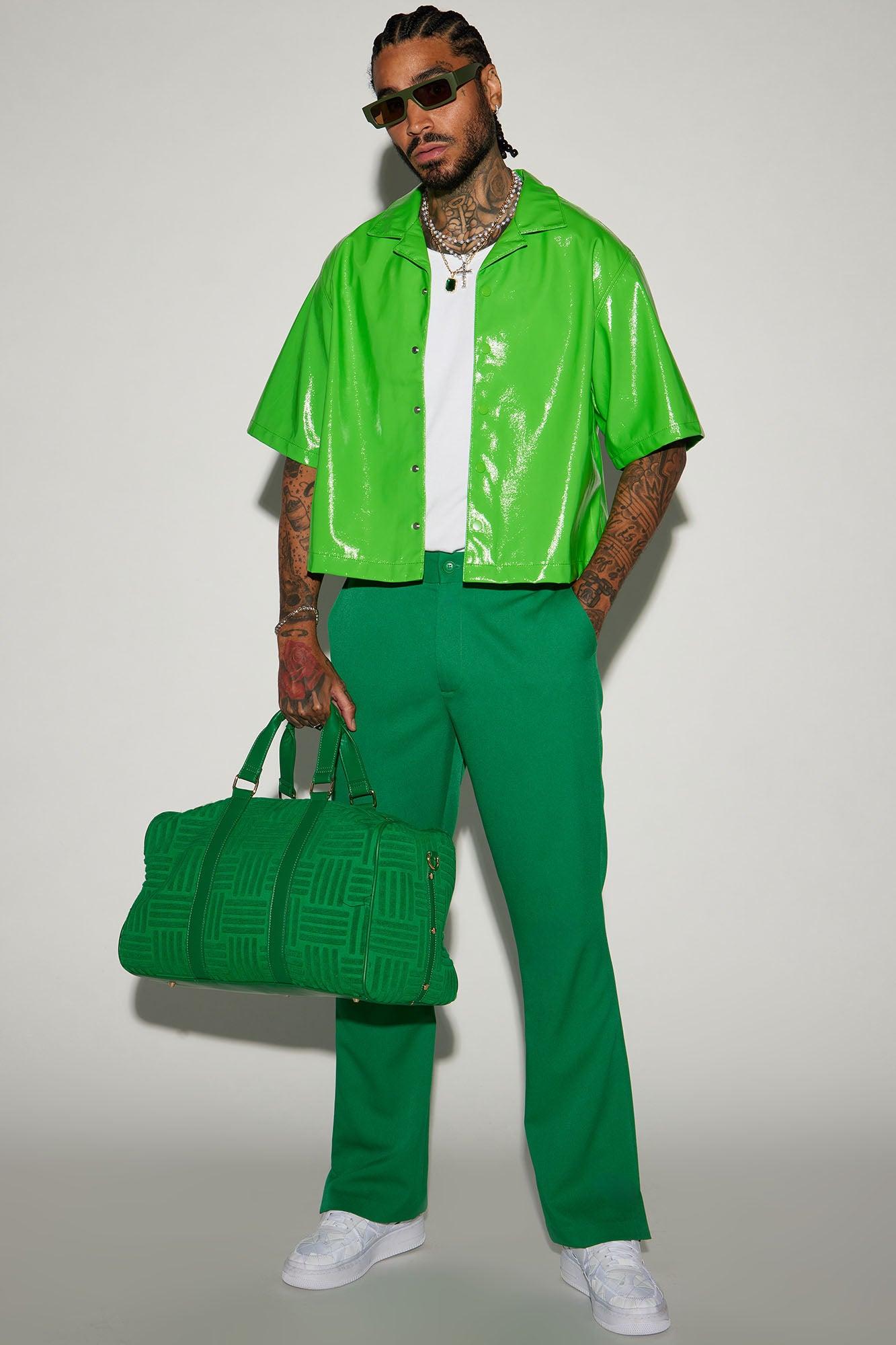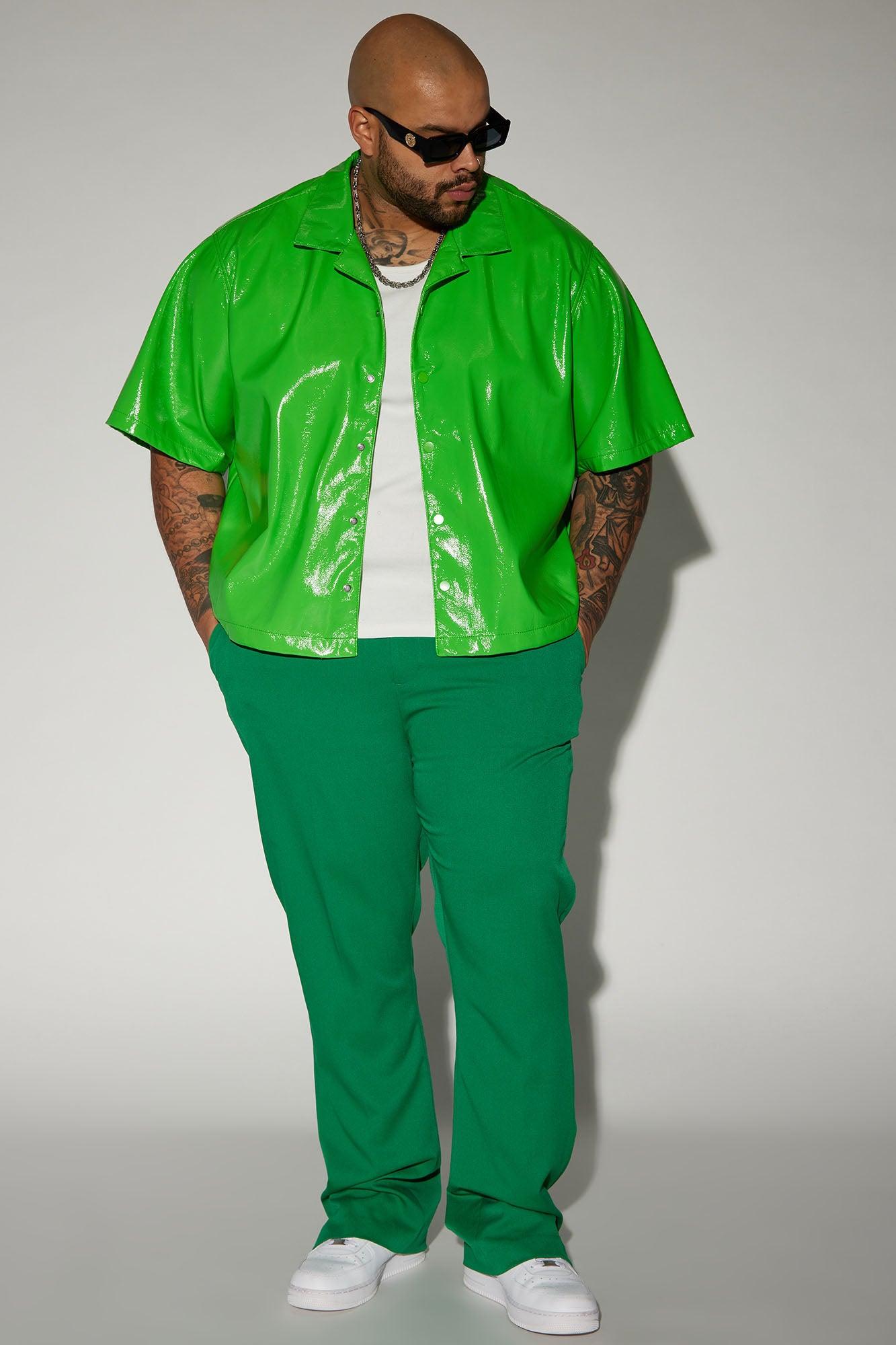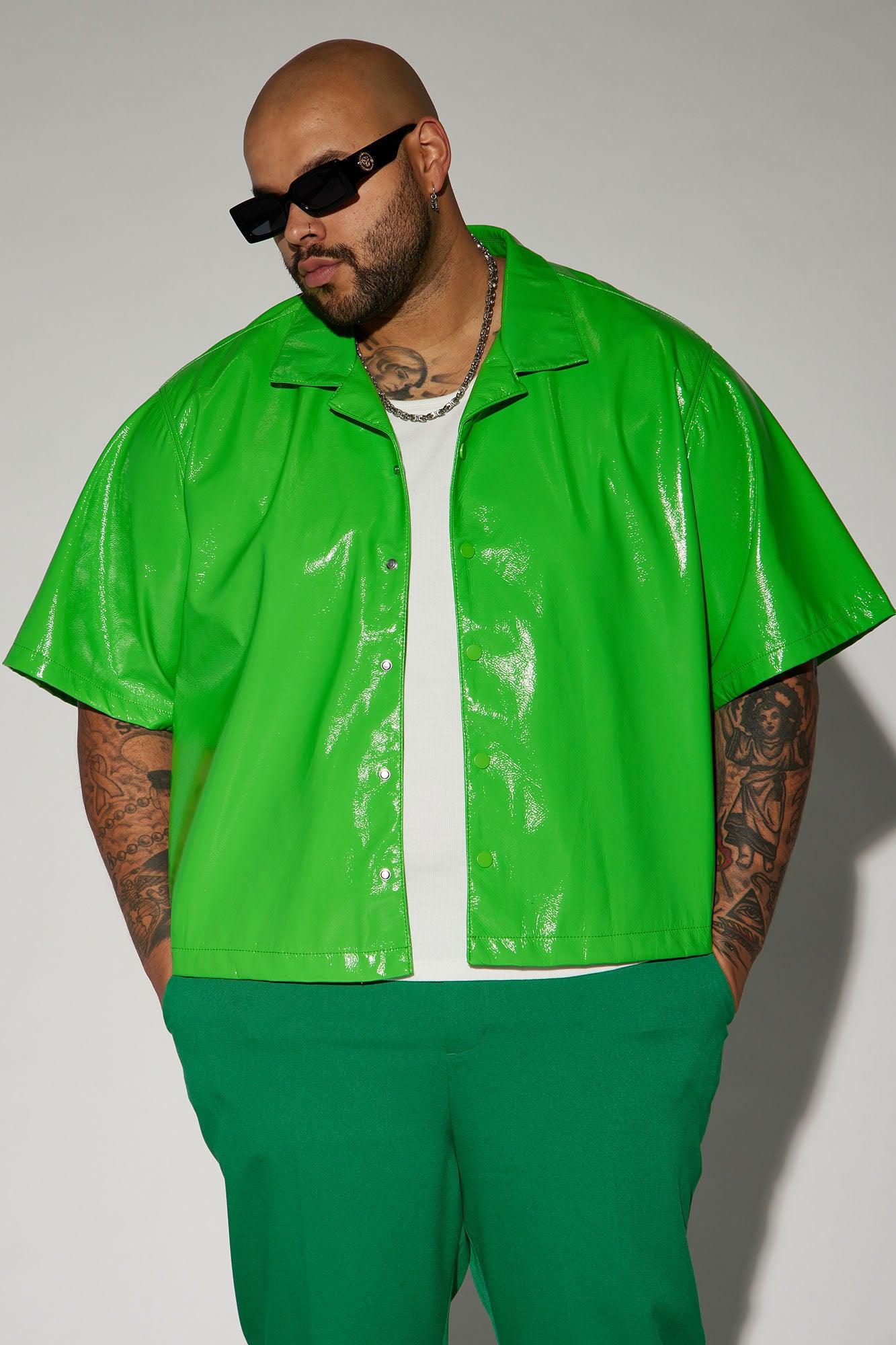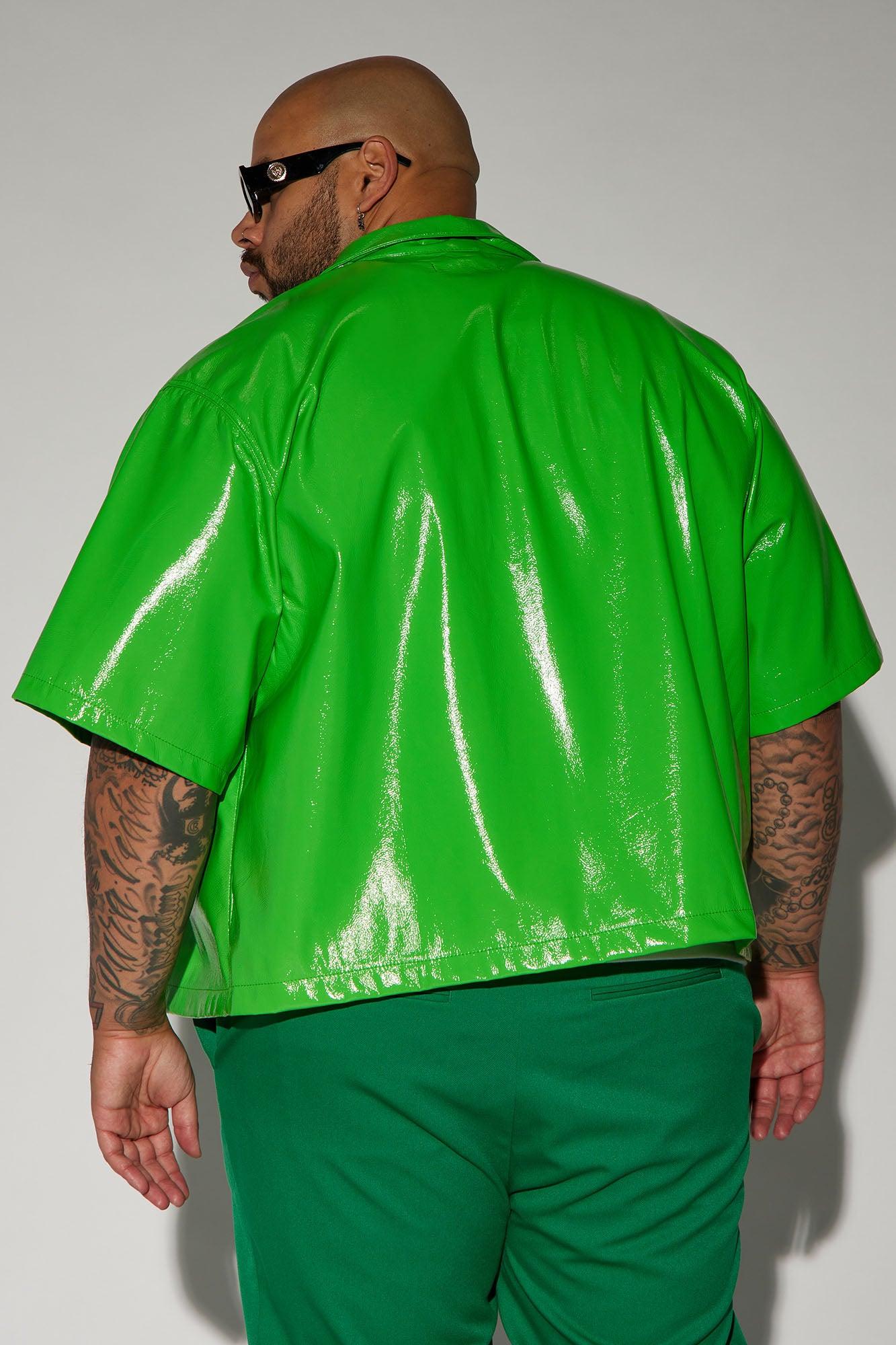 Available In Green. Fold Down Collar Front Button Closure Short Sleeve Pair With "Da Baddie Faux Leather Relaxed Flare Pants" Pair With Da Baddie Faux Leather Carpenter Flare Pants Shell & Coating: 100% Polyurethane Backing: 100% Polyester Imported California Proposition 65 WARNING: Cancer and Reproductive Harm - www.P65Warnings.ca.gov.