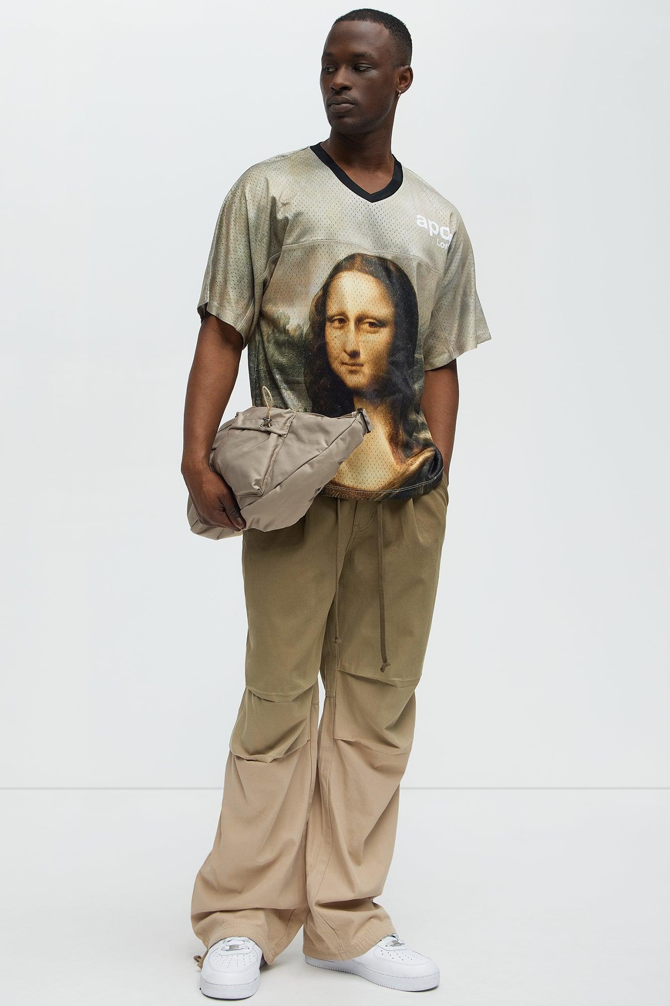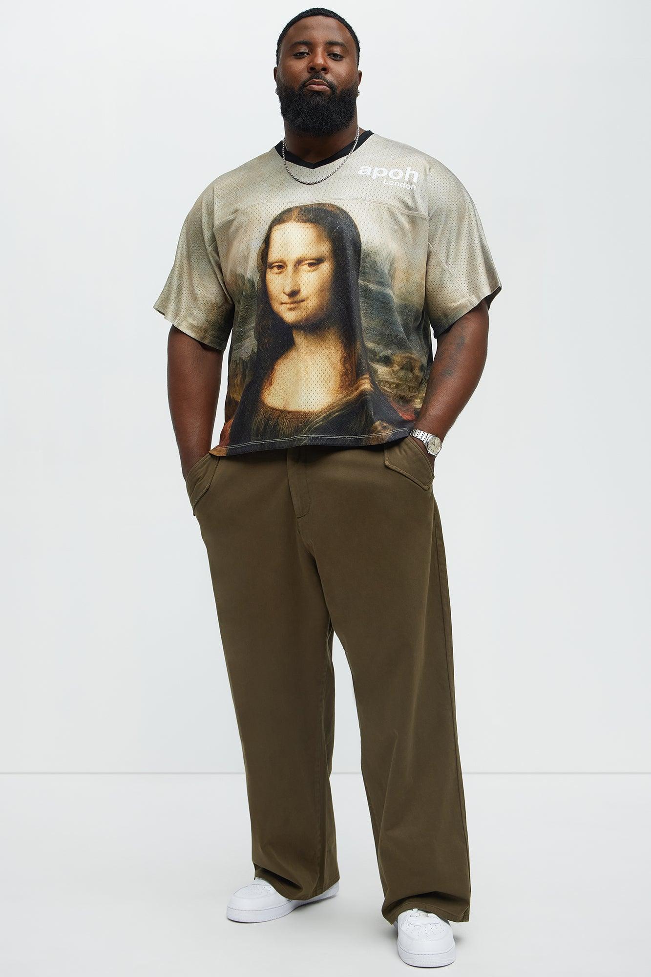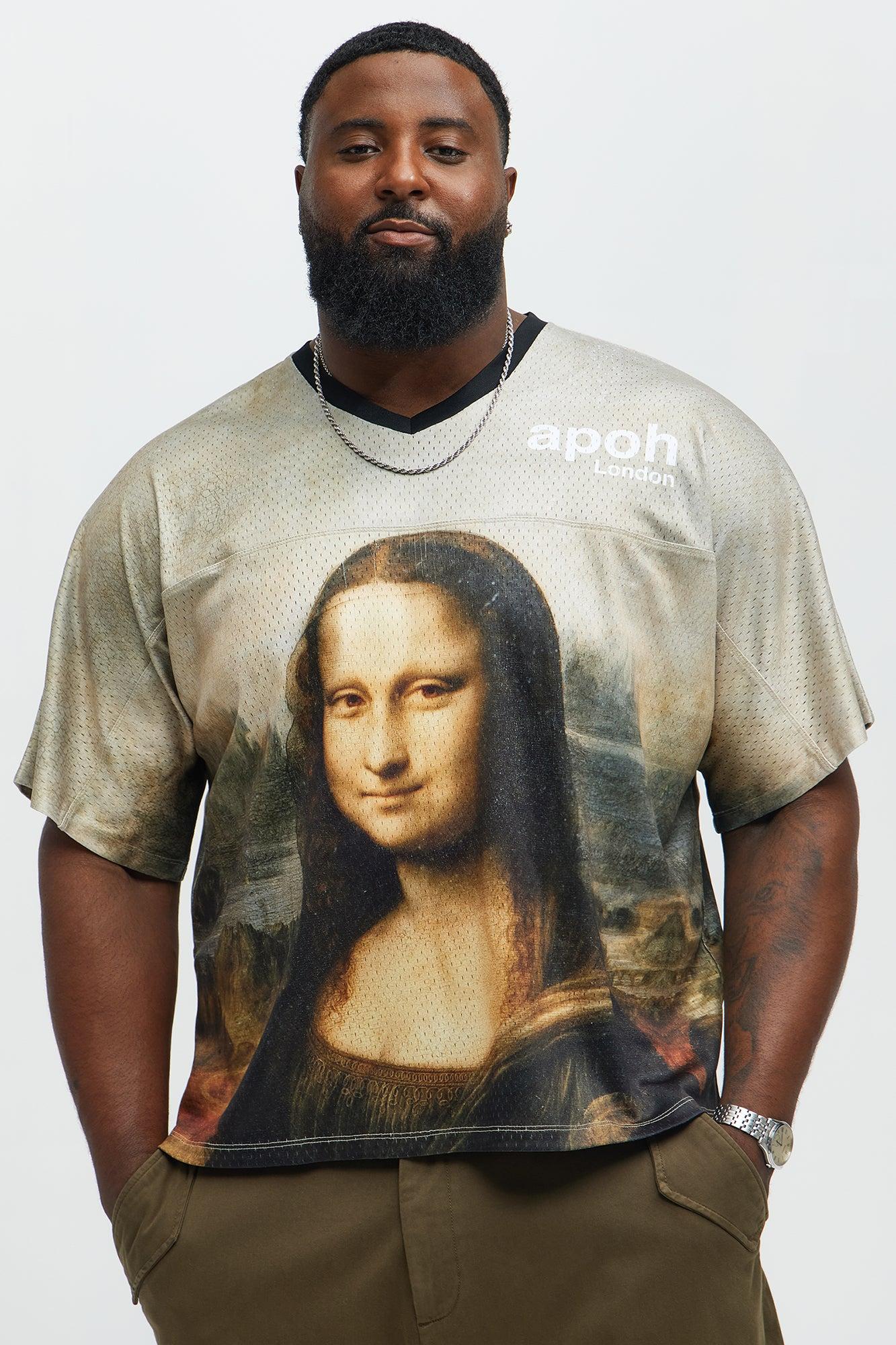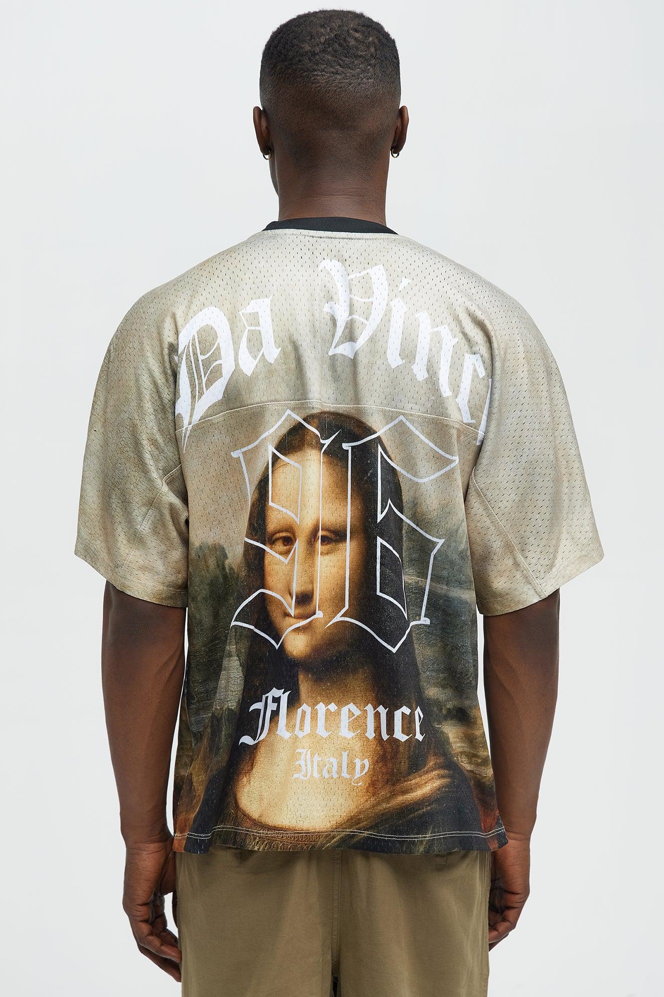 Available In Multi Color. V-Neck Contrast Trim Mona Lisa Front and Back Graphic Back Davinci Verbiage Graphics Short Sleeves 100% Polyester Disclaimer: Due To The Printing Process A Difference In Saturation May Occur. Each Garment Is Unique. Print Placement Will Vary. Imported