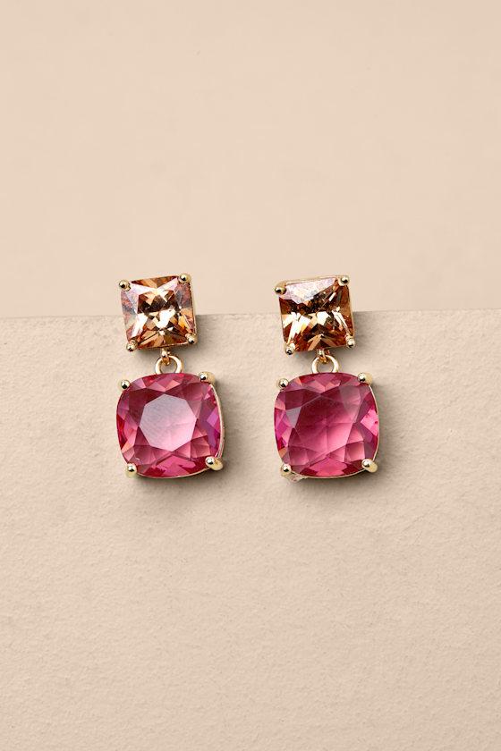 Define your sophisticated ensembles with these ultra-chic drop earrings, crafted with shiny, gold-toned metal settings that effortlessly catch the light. Square, sparkling rose pink rhinestone posts support larger magenta-hued rhinestones that dangle and dazzle below for a luxe finish.
