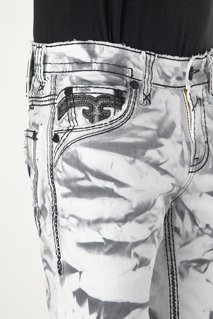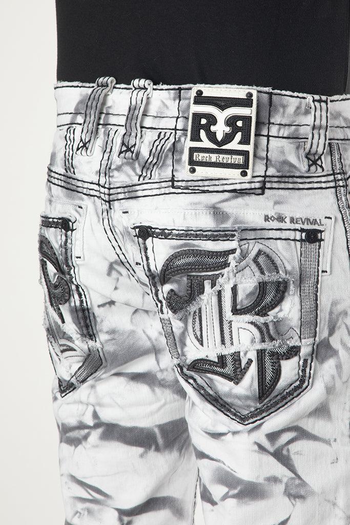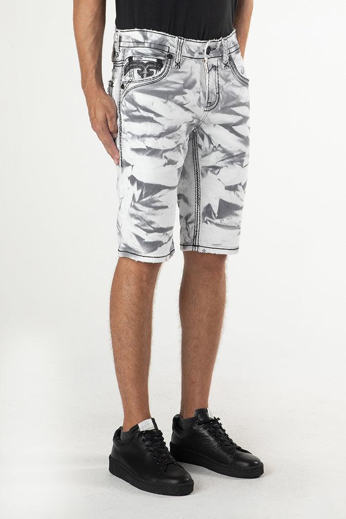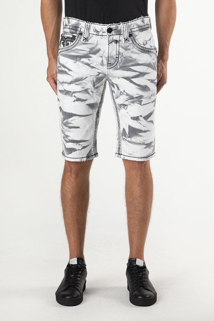 Dangy Denim Shorts by Rock Revival feature a relaxed silhouette in a statement tie-dye wash, designed in Los Angeles, California. Premium stretch denim for comfort and durability Signature Double R back pocket decoration with grey stitching and black leather detailing Custom black hardware throughout Beige and black leather waist patch engraved with 'Rock Revival' Model is 6'2" and wearing a size 32