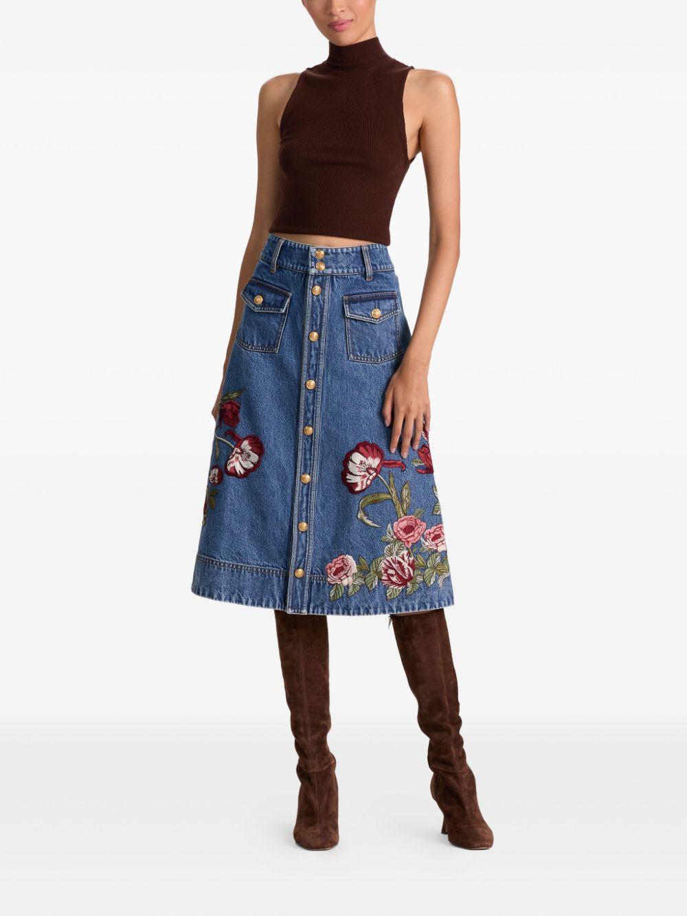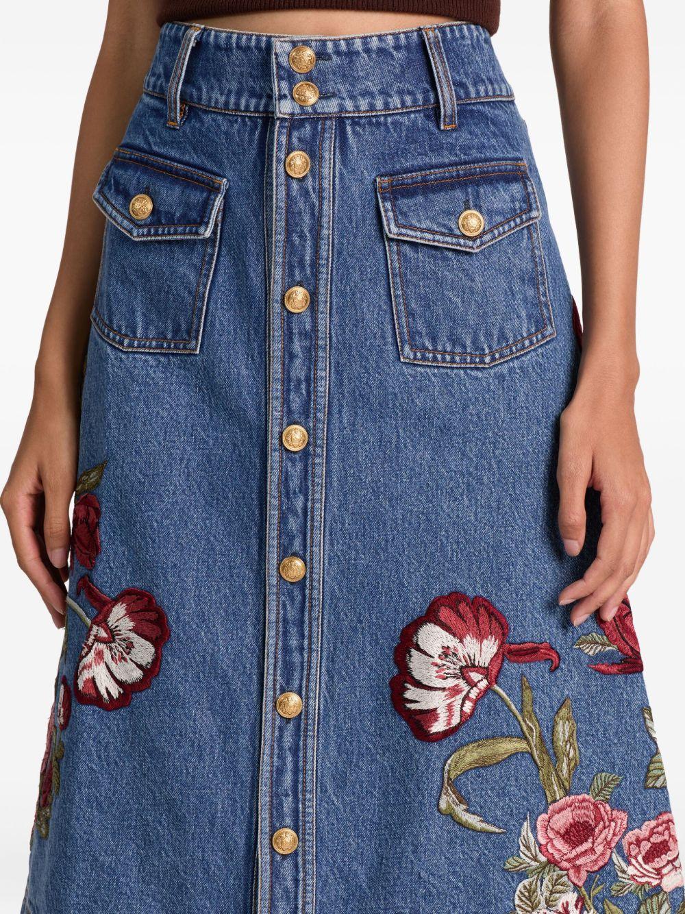 Dahlia floral-embroidered denim skirt