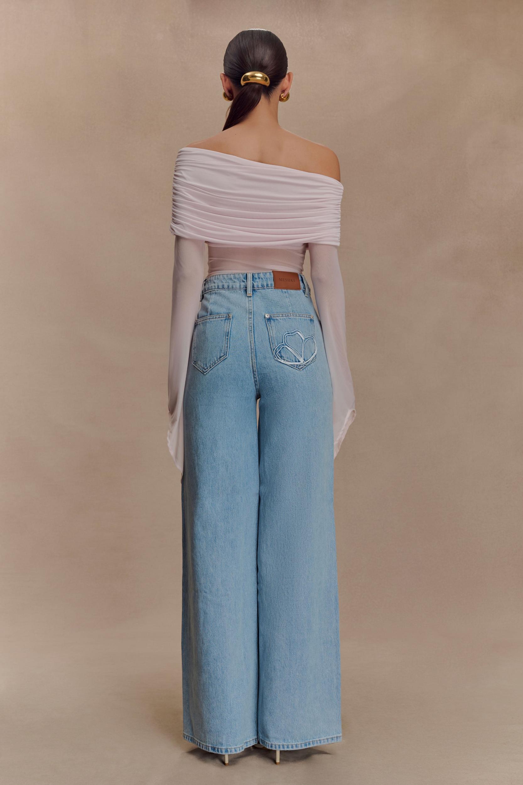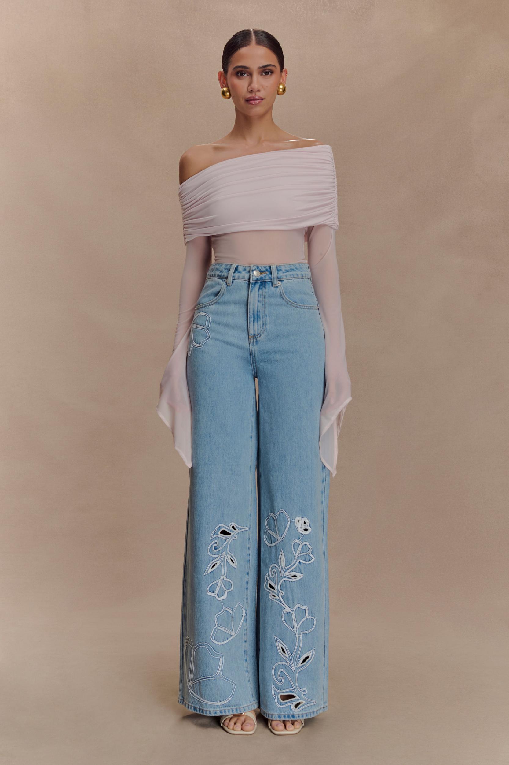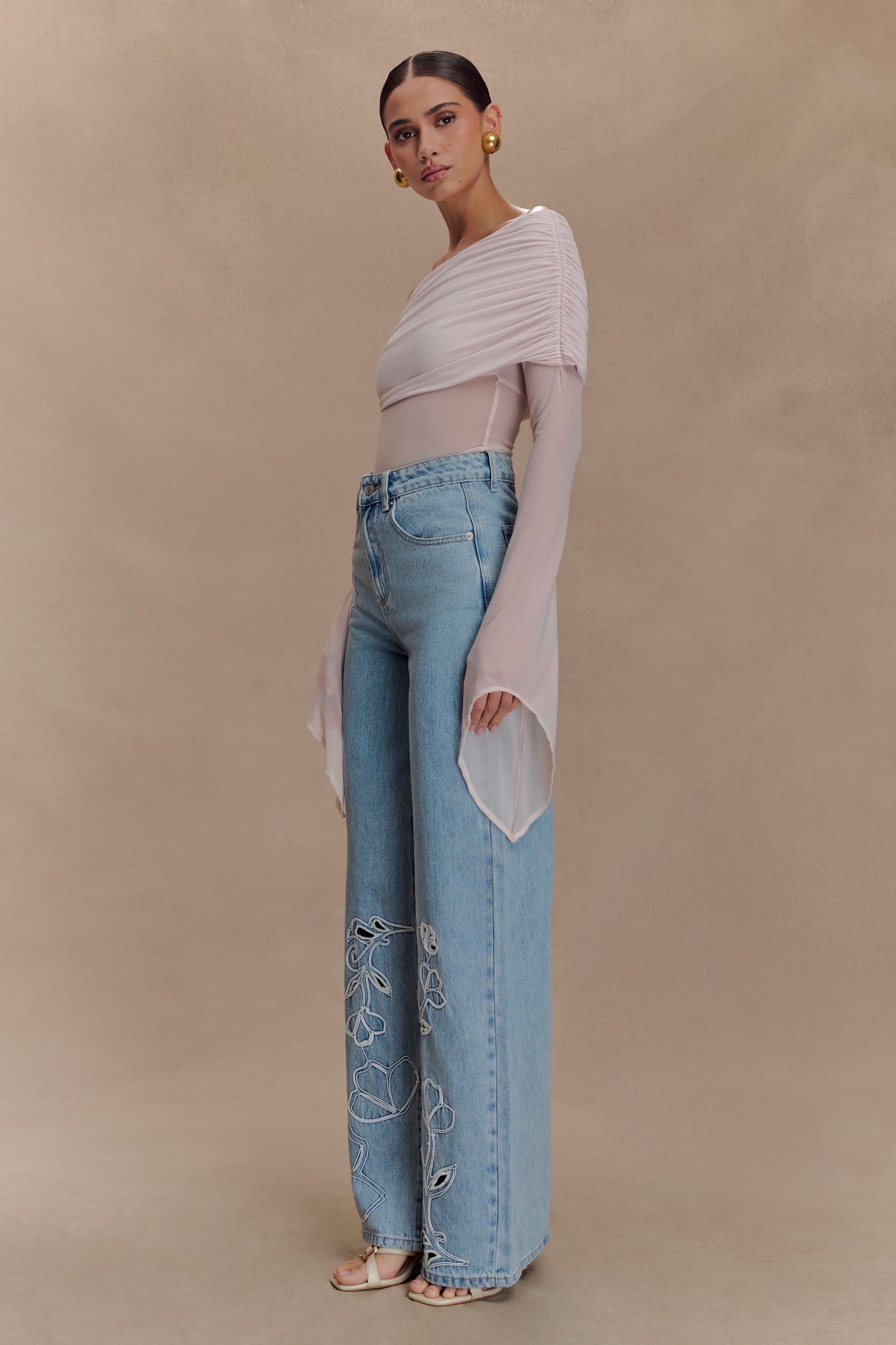 A moment of modern elegance. Make an unforgettable statement in the Dahlia One Shoulder Top. Designed with an asymmetrical neckline and off-shoulder ruching, this piece brings refined drama to your evening ensemble. The sheer mesh bodice and sleeve exude effortless allure, while the long sleeve is finished with flared, asymmetric cuffs for an unexpected touch. Partially lined for coverage, this top is made to flatter and elevate—perfect for styling with tailored trousers or a sleek midi skirt.