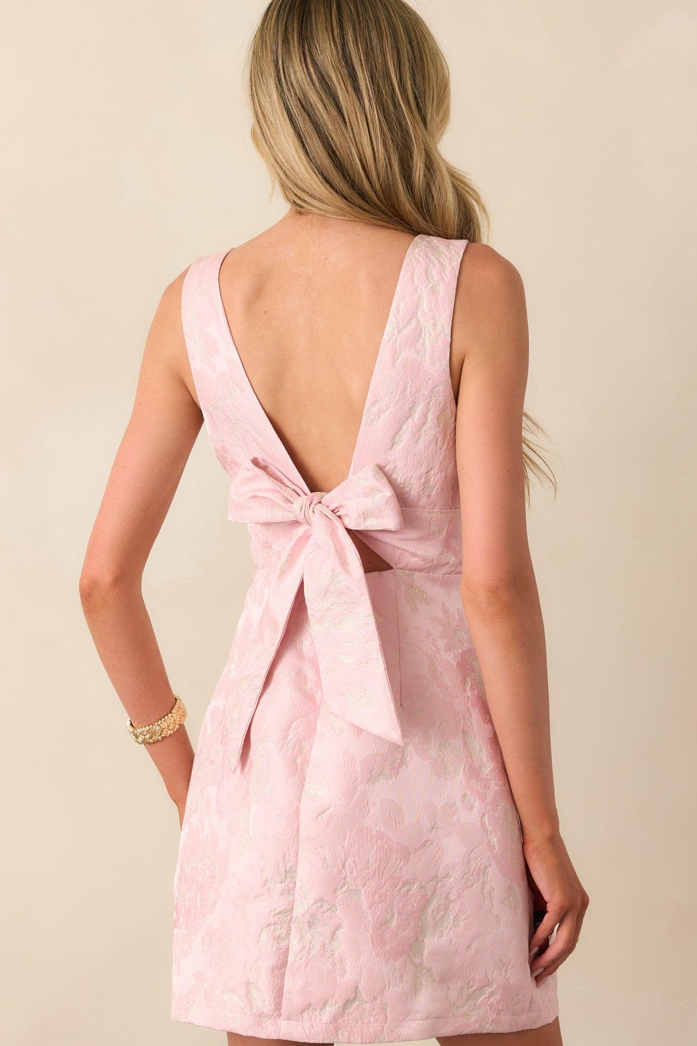 Get ready to turn heads and make a statement with our charming Daily Delight Light Pink Floral Jacquard Mini Dress. Let the delicate floral pattern and exquisite jacquard fabric wrap you in elegance and confidence. Perfect for any special occasion, this dress is a must-have for your wardrobe! This light pink mini dress features a discreet back zipper, self-tie back bow, sleeveless design, gold detailing throughout, v-neckline, and a mini length.