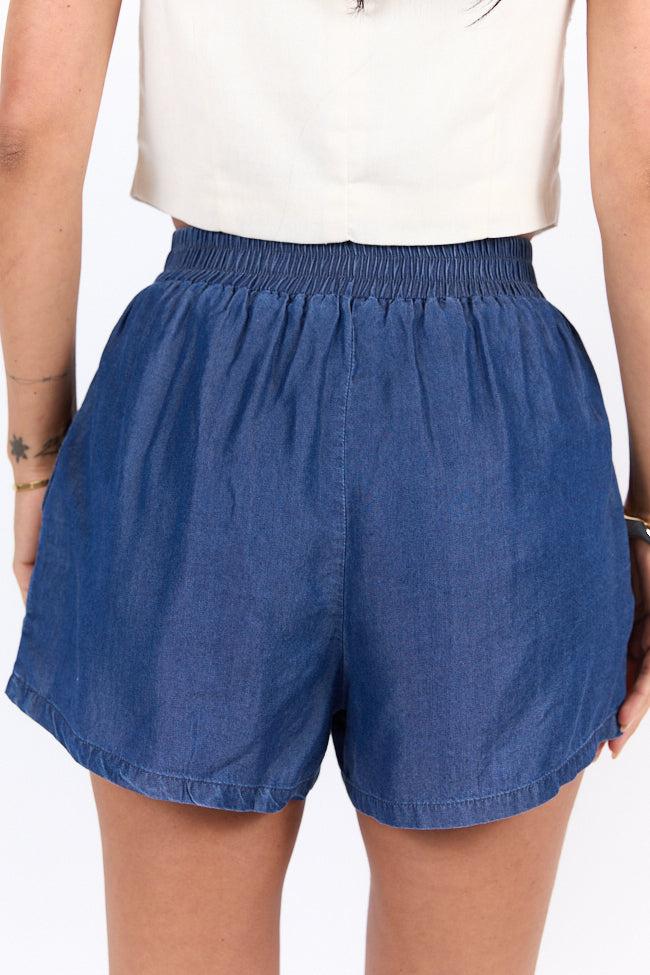 Details Dark Wash Pull On Chambray Shorts Fabric only has stretch in waistband Elastic waistband, functional pockets Unlined Size small inseam: 2" Material and Care 100% tencel Machine wash cold, line dry Patterns may vary Materials may have natural variations Colors may vary from different viewing devices.