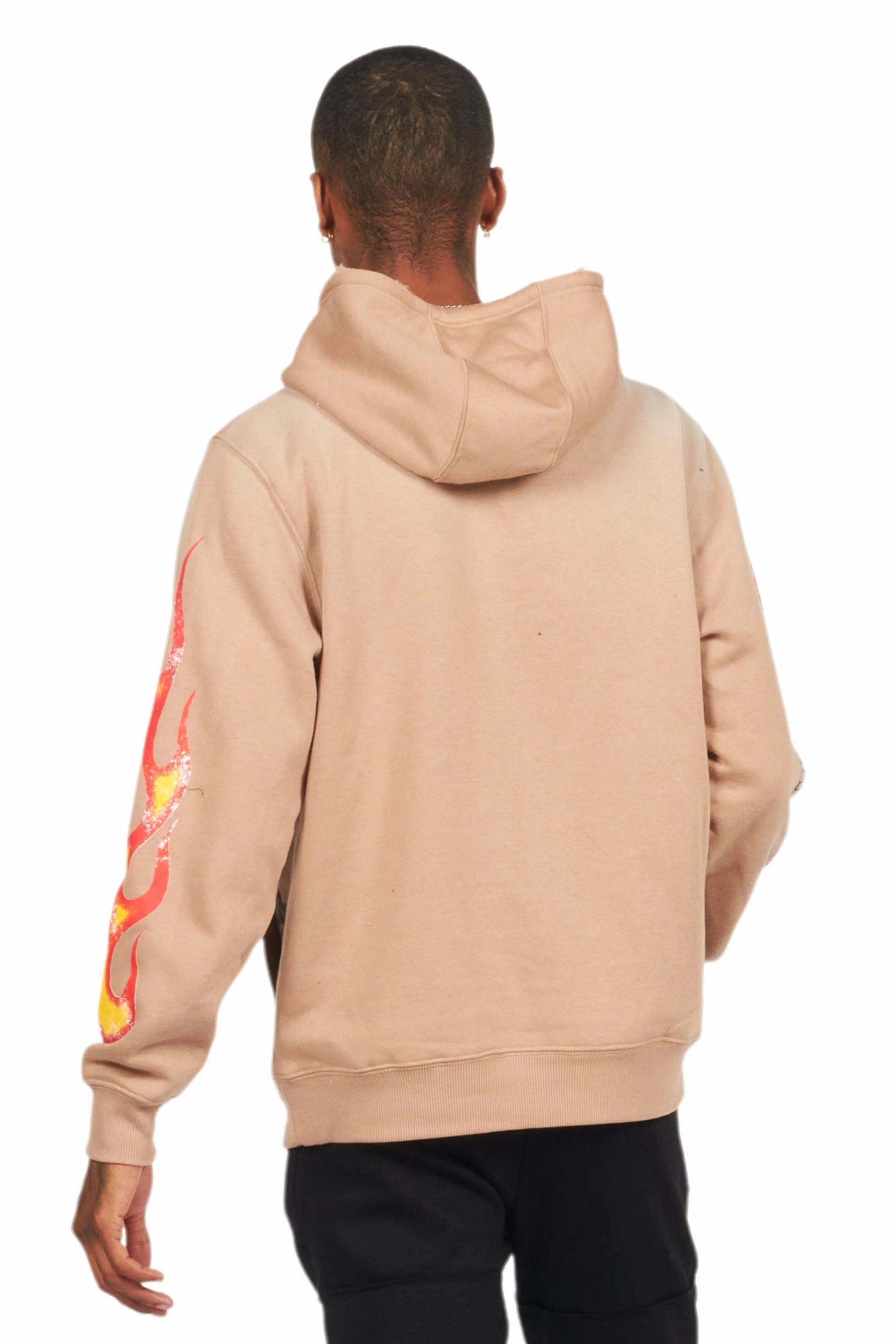An urban streetwear hoodie for men in beige. Designed with organic cotton and custom detailing for a dope everyday style. Drawstring hood Long sleeves Ribbed knit trims Kangaroo pocket Pullover style Relaxed-fit Printed RSO logo Custom printed graphics