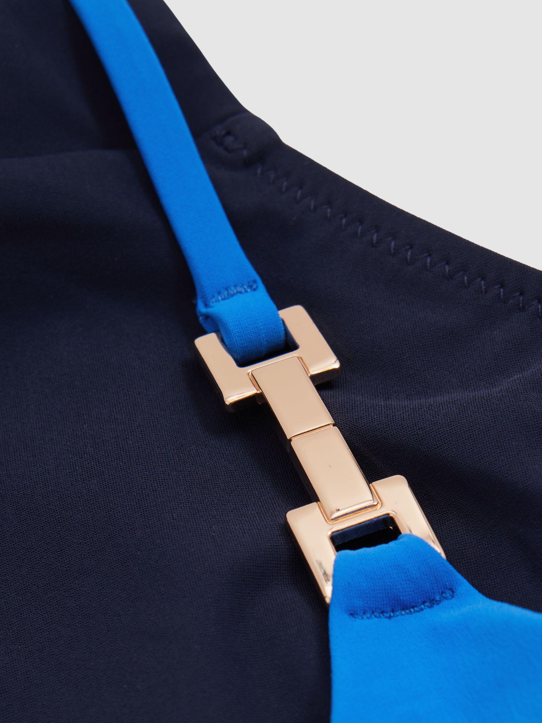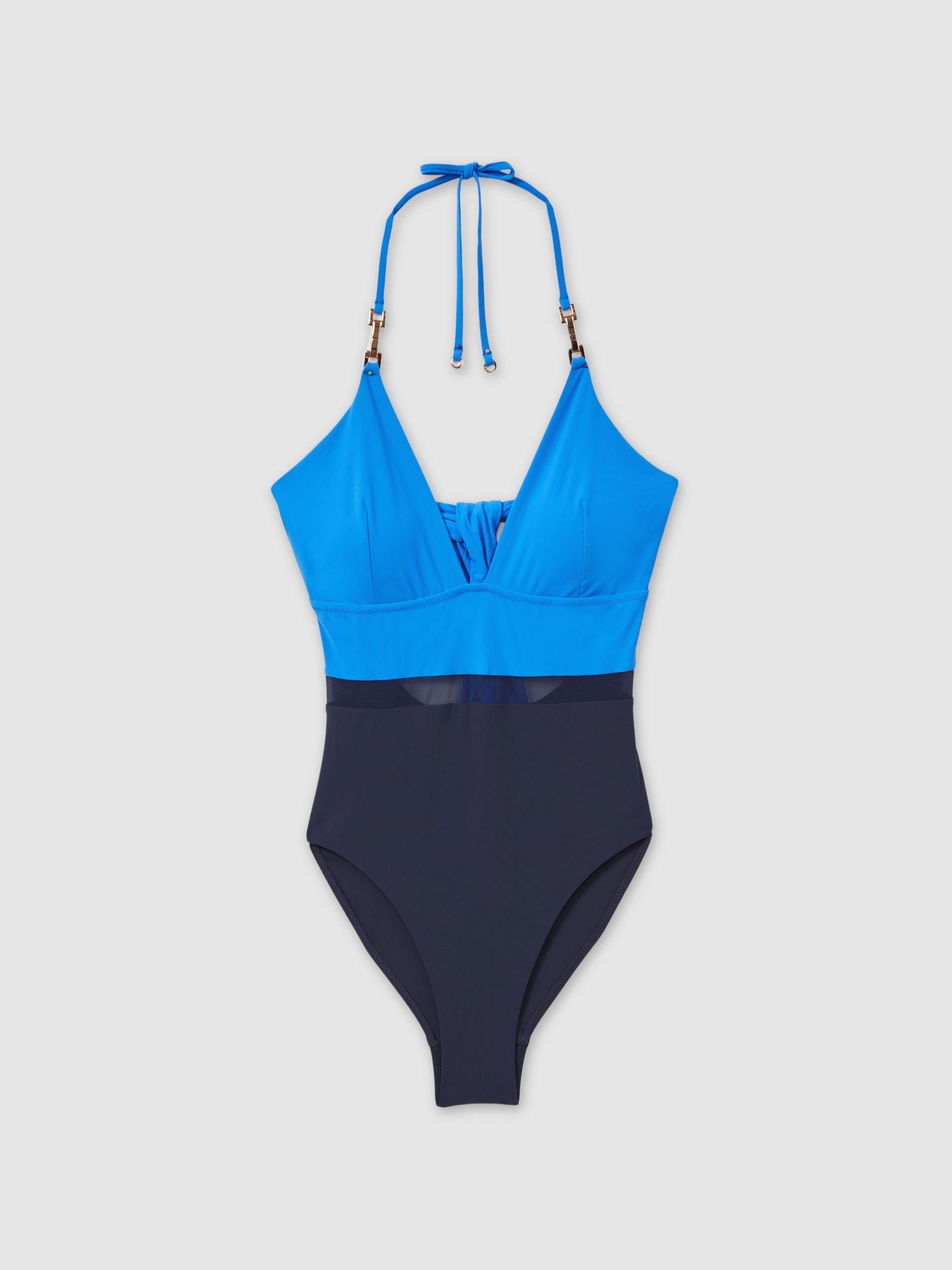 The Daisy swimsuit is designed in a two-tone palette with a mesh trim around the waist. Gold-tone hardware features to the halter-neck fastening. Colourblock design. Self-tie halter neckline. Mesh detailing. Gold-tone hardware. Removable padding. Tie-back fastening. The model is wearing a size 8. Measurements of model: Height 5ft 10'' / 178cm.
