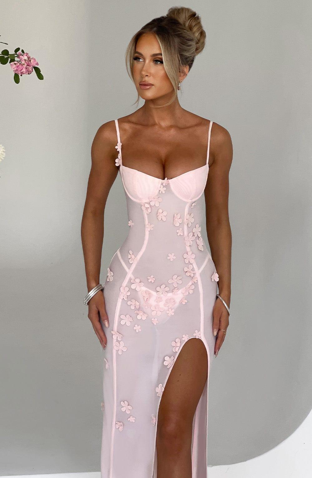 Meet Dalary... we promise you aren't dreaming! This one-of-a-kind dress is soft girl perfection, made in a delicate sheer mesh with playful flower appliques scattered over the body. With a cupped bust to frame your chest and a thigh high split, this dress moulds to the contours of your body for that second skin fit. Colour: Blush. Premium sheer stretch mesh. Cupped bust. Flower appliques. Thigh high split. Moulds to the contours of your body. Second skin fit. Maxi length. Model is an XS and is wearing an XS. Macy bottoms sold separately.ÂÂ