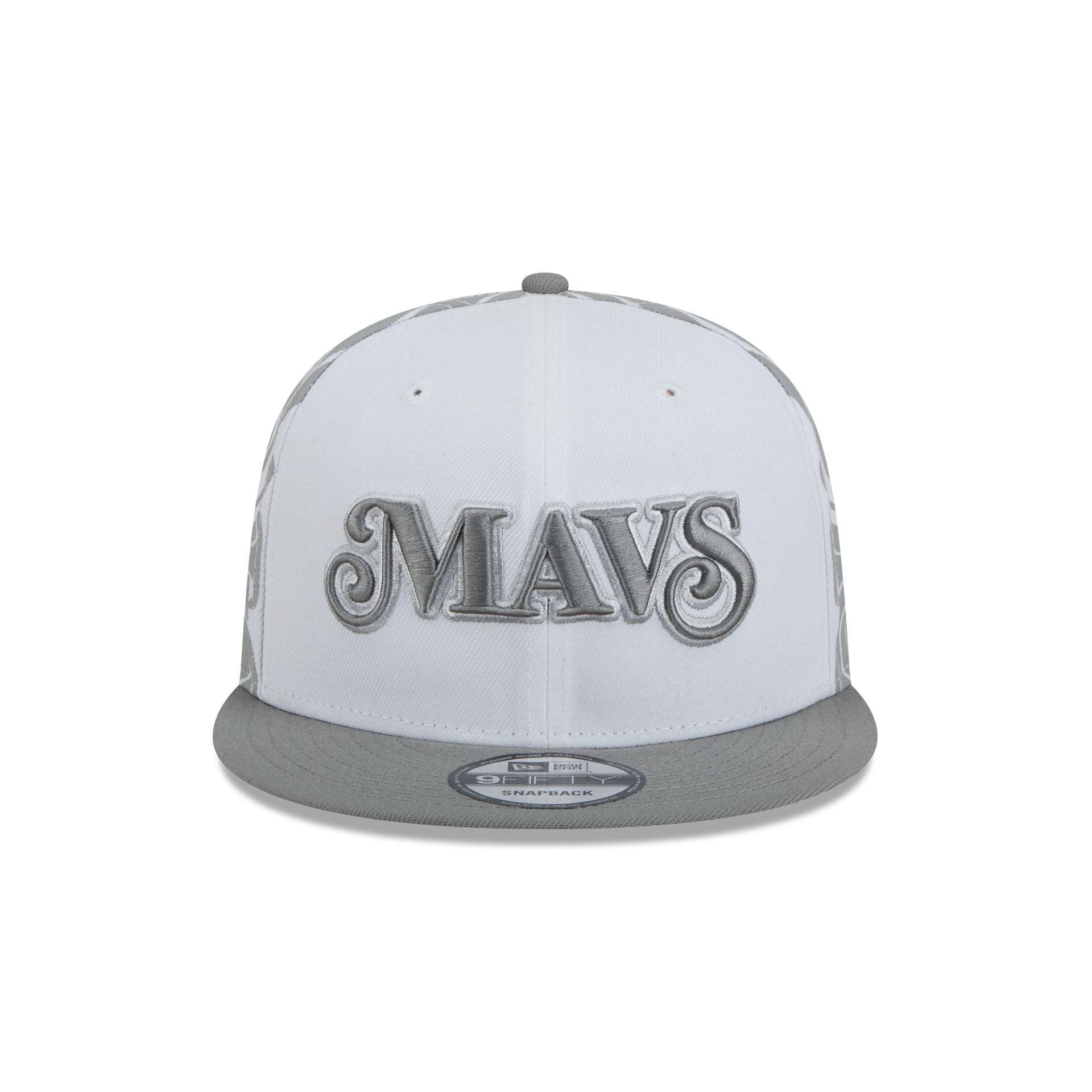 The Dallas Mavericks 2024 City Edition 9FIFTY Snapback features an embroidered Mavericks wordmark at the front panels with an NBA Logoman above a snapback closure at the rear. Additional details include a team logo at the right-wear side, screen-printed art on the left and right panels, and a gray undervisor.