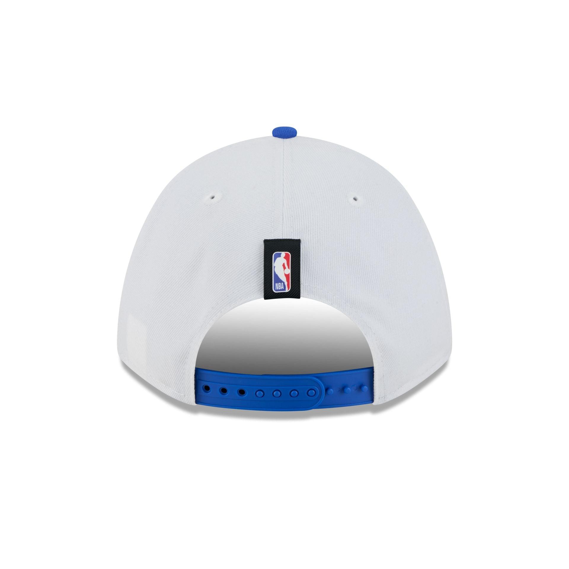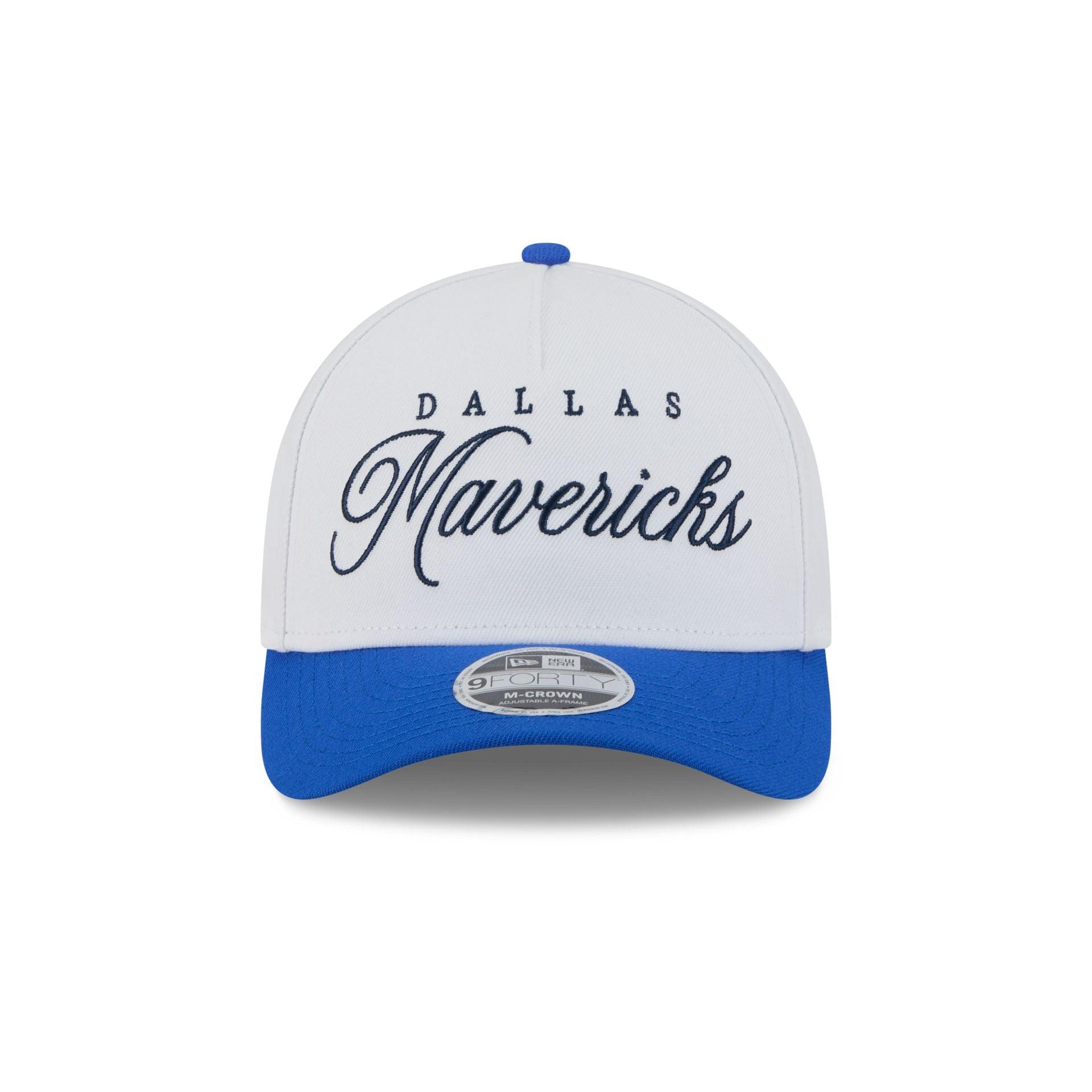 The Dallas Mavericks 2025 Draft 9FORTY M-Crown A-Frame Snapback features an embroidered Mavericks script wordmark at the front panels with a team logo at the right-wear side. Additional details include a woven silicone NBA Logoman patch above an adjustable snapback closure at the rear and a gray undervisor.