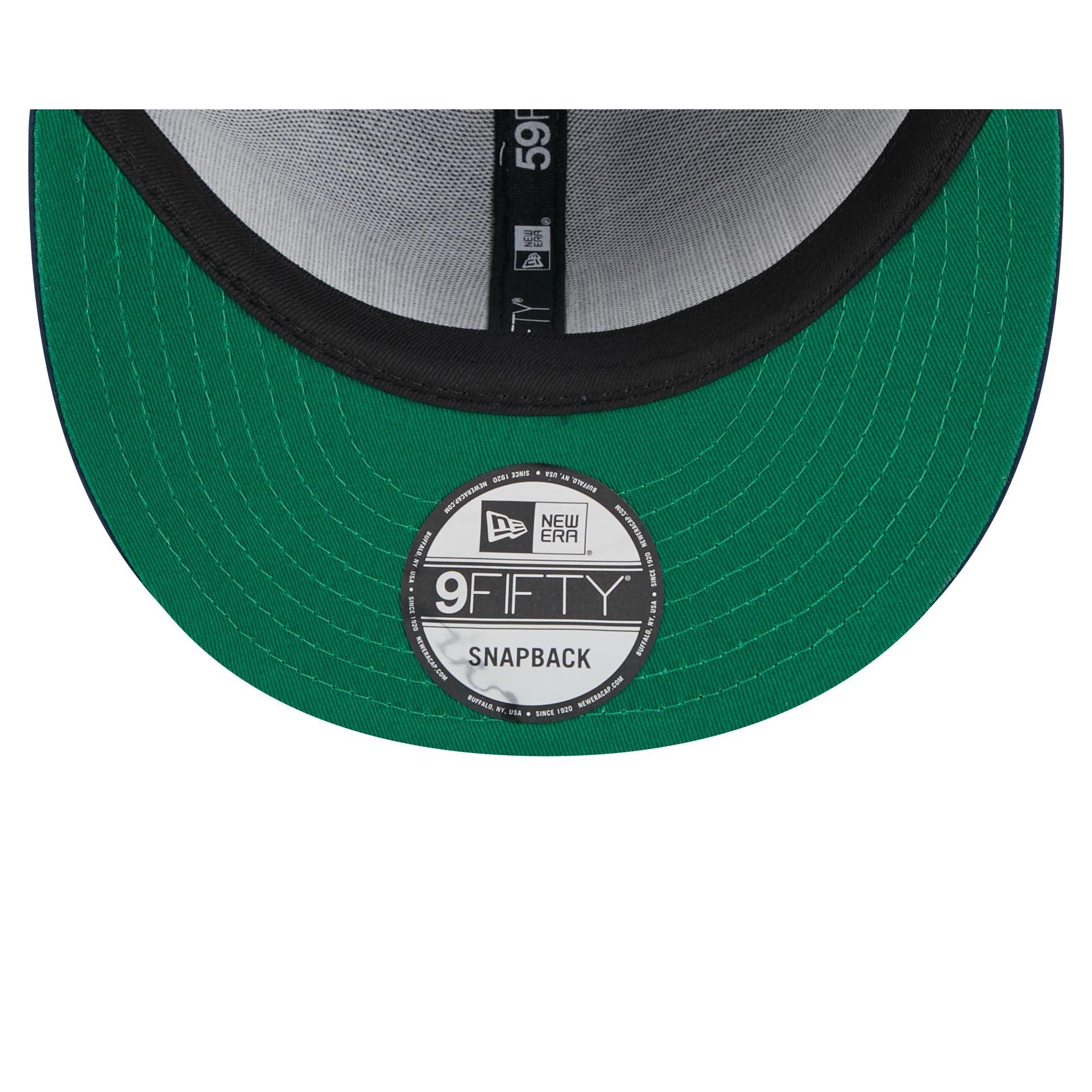 The Dallas Mavericks Satin Pin 9FIFTY Snapback features an embroidered Mavericks wordmark at the front panels against a satin fabrication throughout the cap and a logo at the right-wear side. Additional details include a New Era Pin at the front left panel a snapback closure at the rear, and a green undervisor.