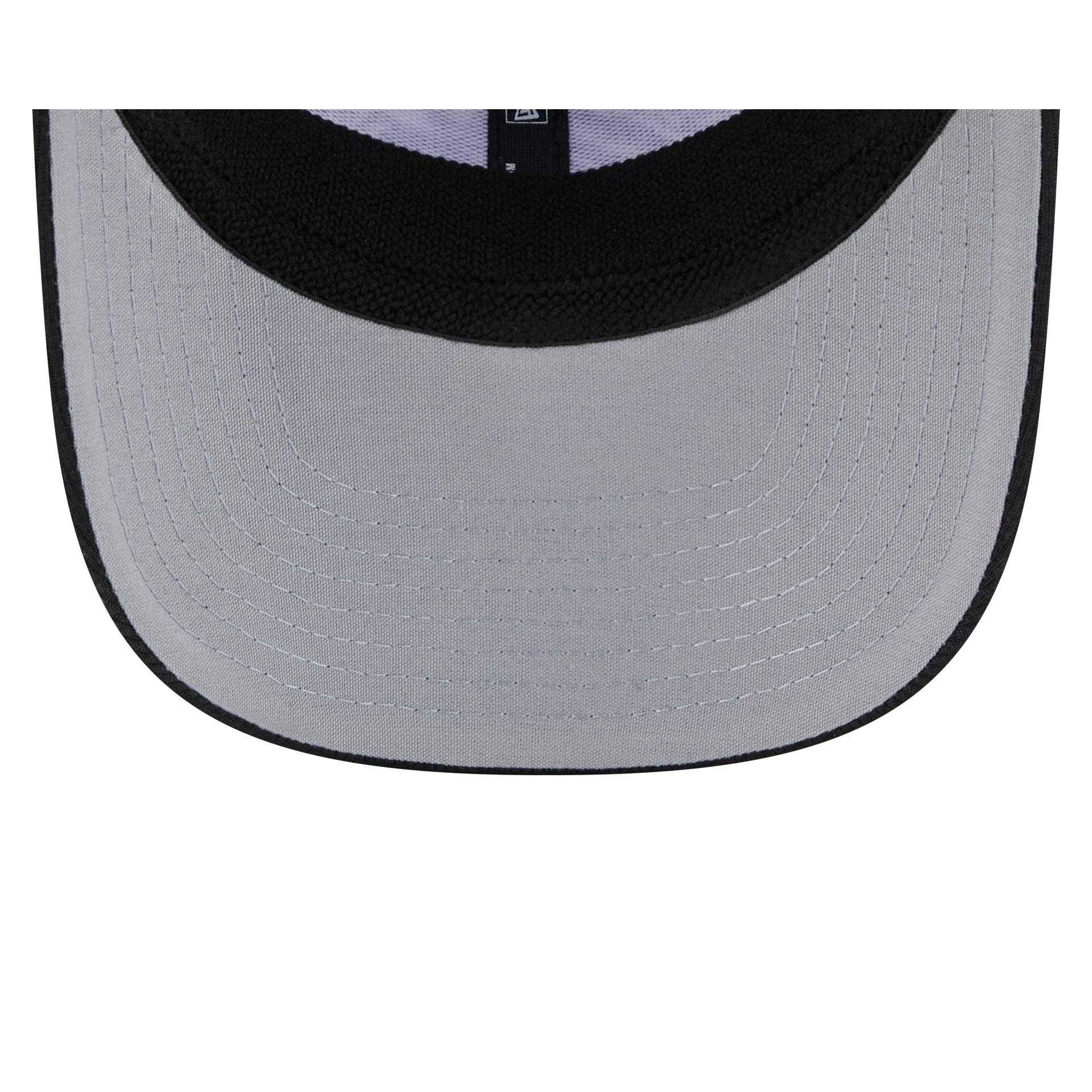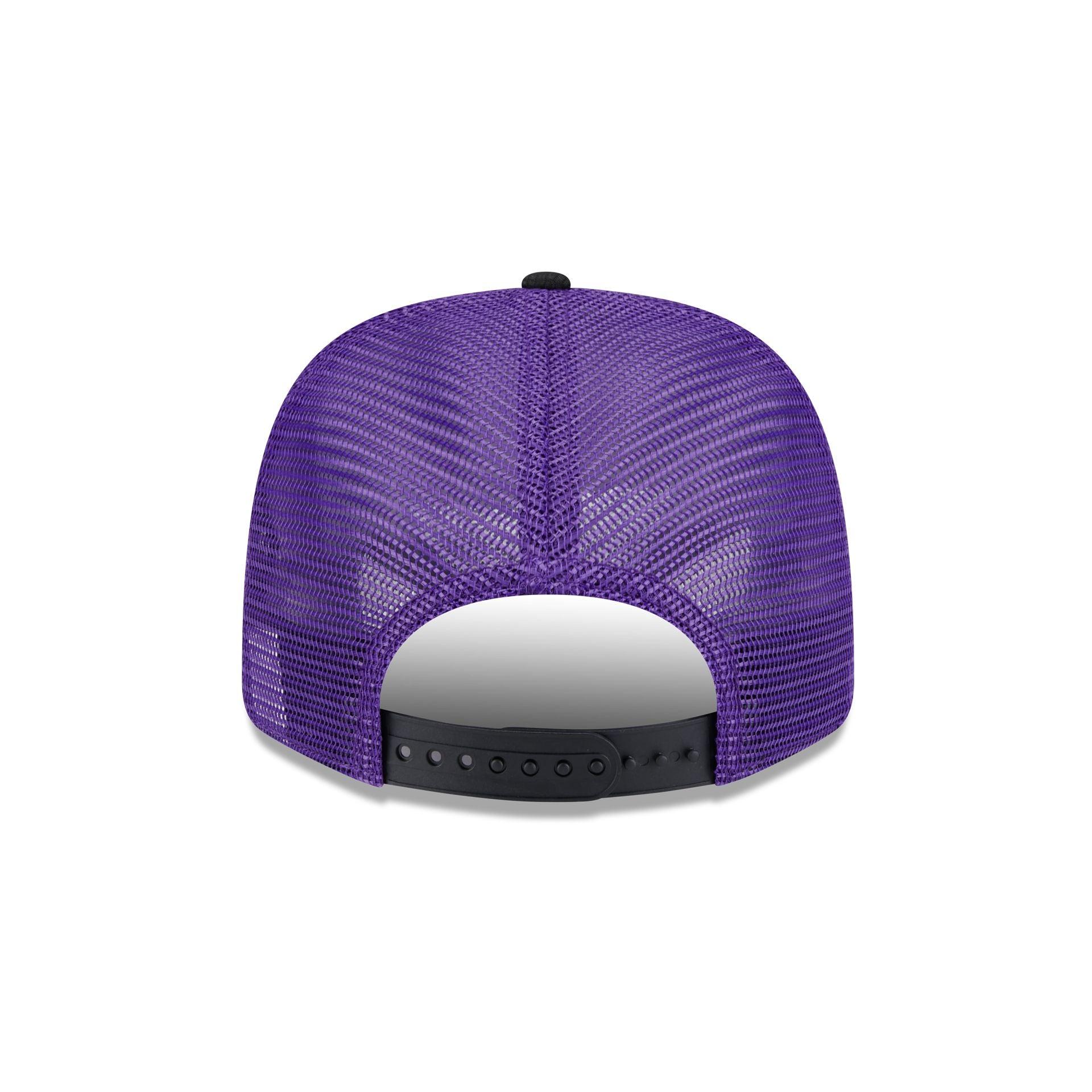 The Colorado Rockies 2025 Batting Practice 9SEVENTY Trucker Hat features an embroidered Rockies logo at the front panels with a mesh back, a snapback closure at the rear, and a gray undervisor.