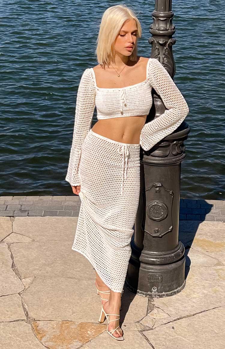 White Crochet Maxi Skirt HOW TO STYLE: This crochet maxi skirt is the perfect day to night vacation piece! Wear it as a bikini cover up or pair it with the matching long-sleeve top for sunset drinks. With an adjustable tie waist, it can be worn low or high waisted. FEATURES: Crochet Adjustable tie up waist Maxi length Sheer Unlined Mid weight crochet material with stretch *We recommend not hanging your crochet products to avoid any fabric stretch