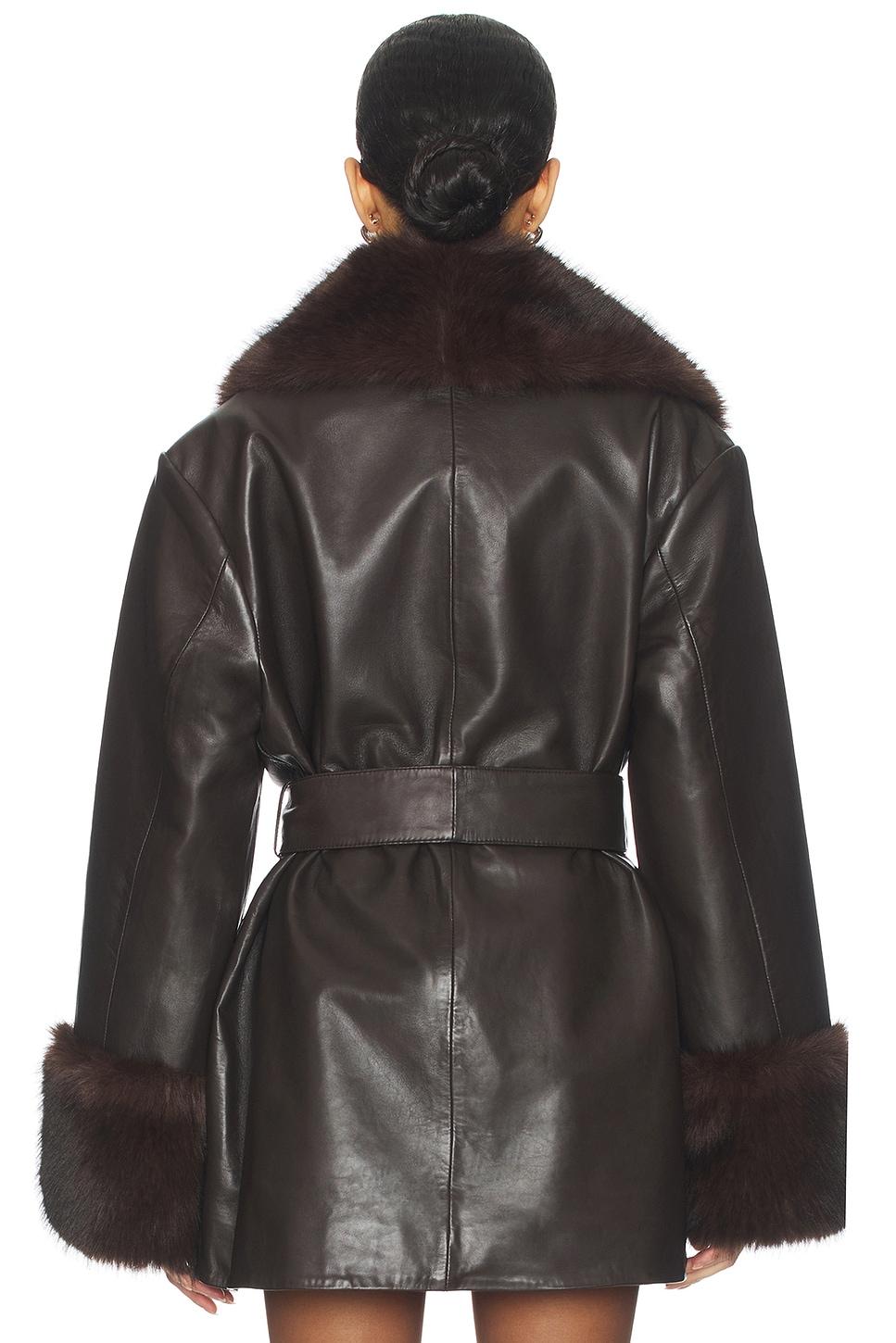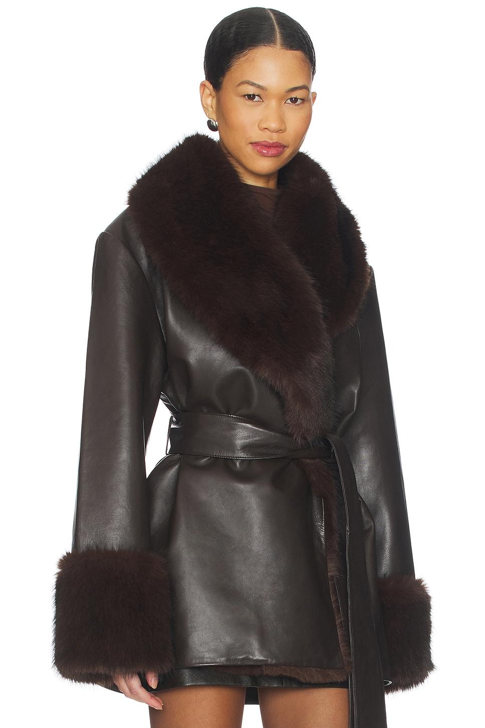 Self: lamb leatherTrim: 100% polyester. Professional leather clean only. Open styling with optional waist tie. Side seam pockets. Midweight leather with faux fur trim. Made in India. Revolve Style No. SERR-WO80. Manufacturer Style No. S-HR26-5322-19.