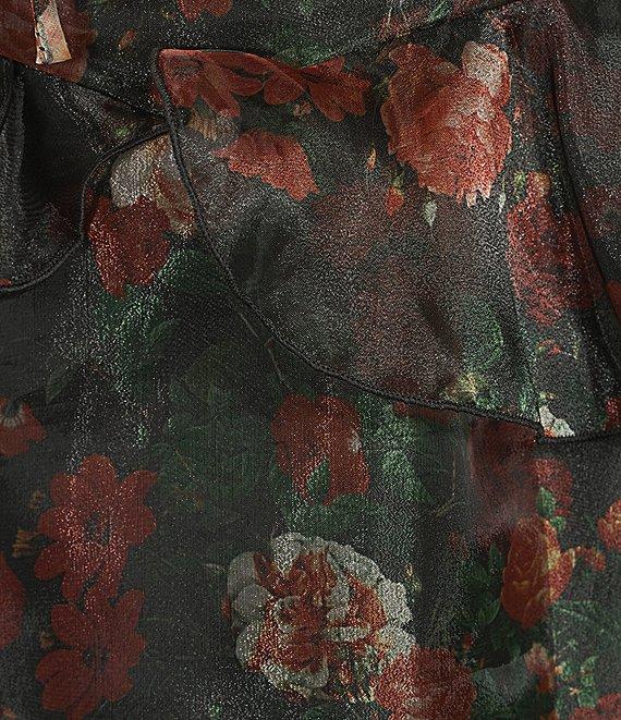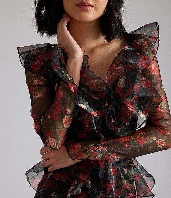 From Damaris Bailey, this dress features: Organza fabrication Scoop neckline with ruffle detail Long sleeves with ruffle wrists Zipper back Fit and flare silhouette Maxi length Silk slip included Approx. 62" in length Polyester Dry clean Made in LA.