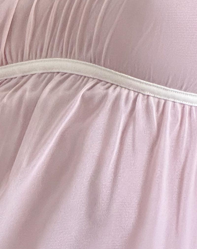 The Damaris top in baby pink, a flowy loose frill top featuring thin tie shoulder strap with ivory binding details above and below the chest and frill neckline with bow at the centre. MODEL WEARS SIZE: SMALL - MODEL HEIGHT:5'9