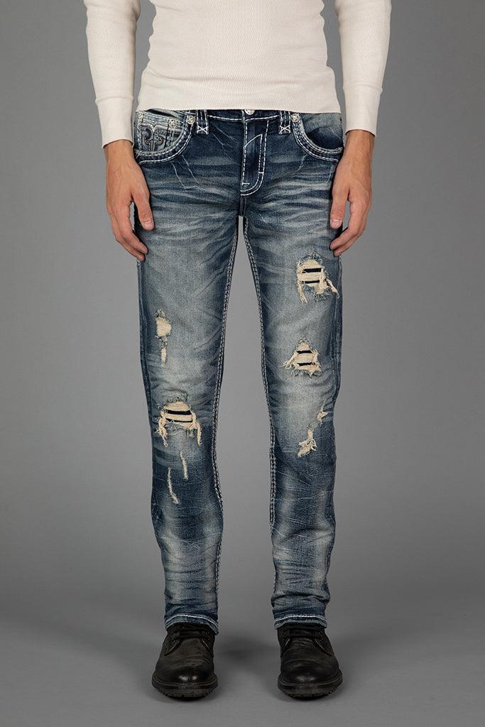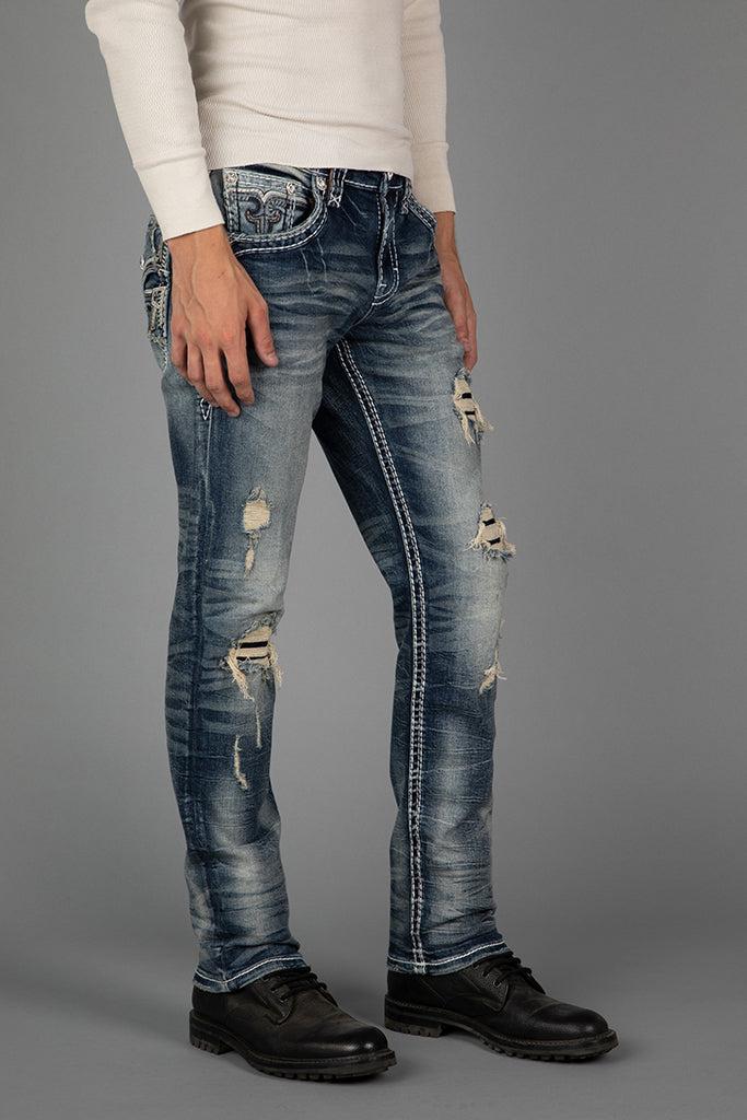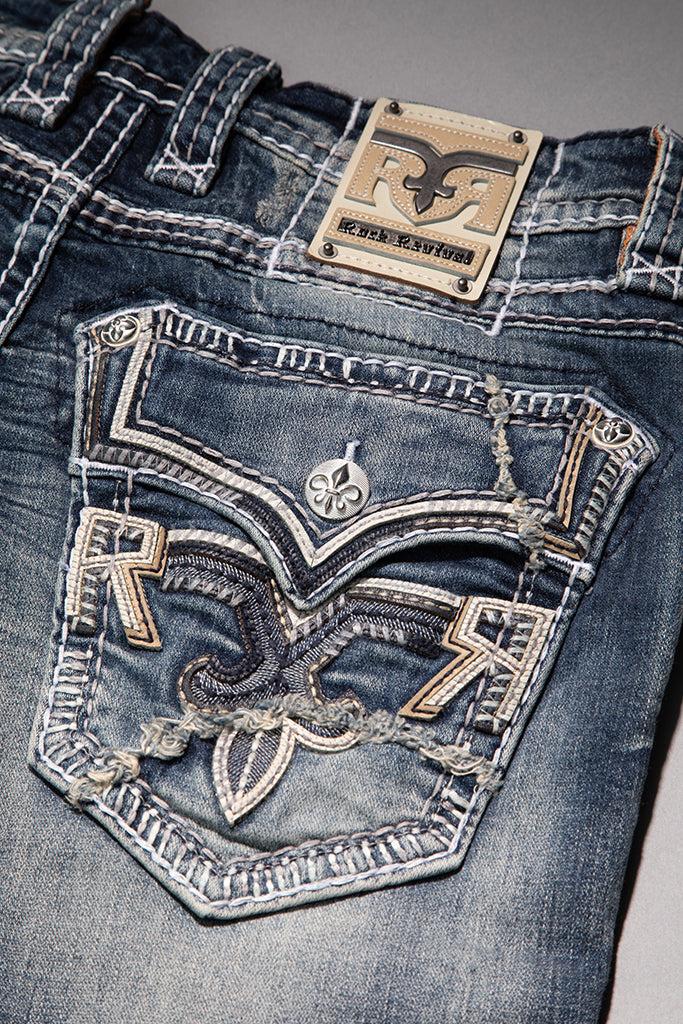Custom silver brushed buttons and rivets decoration throughout. Heavy distressed, hand whiskers and veining on the front legs. Inverted Fleur De Lis frayed back pocket, featuring the iconic “RЯ” decorated with white stitch and beige and white leather. "Rock Revival" metal engraved on an off-white and beige leather patch on the belt loop. Designed with care and creativity in Los Angeles, California.