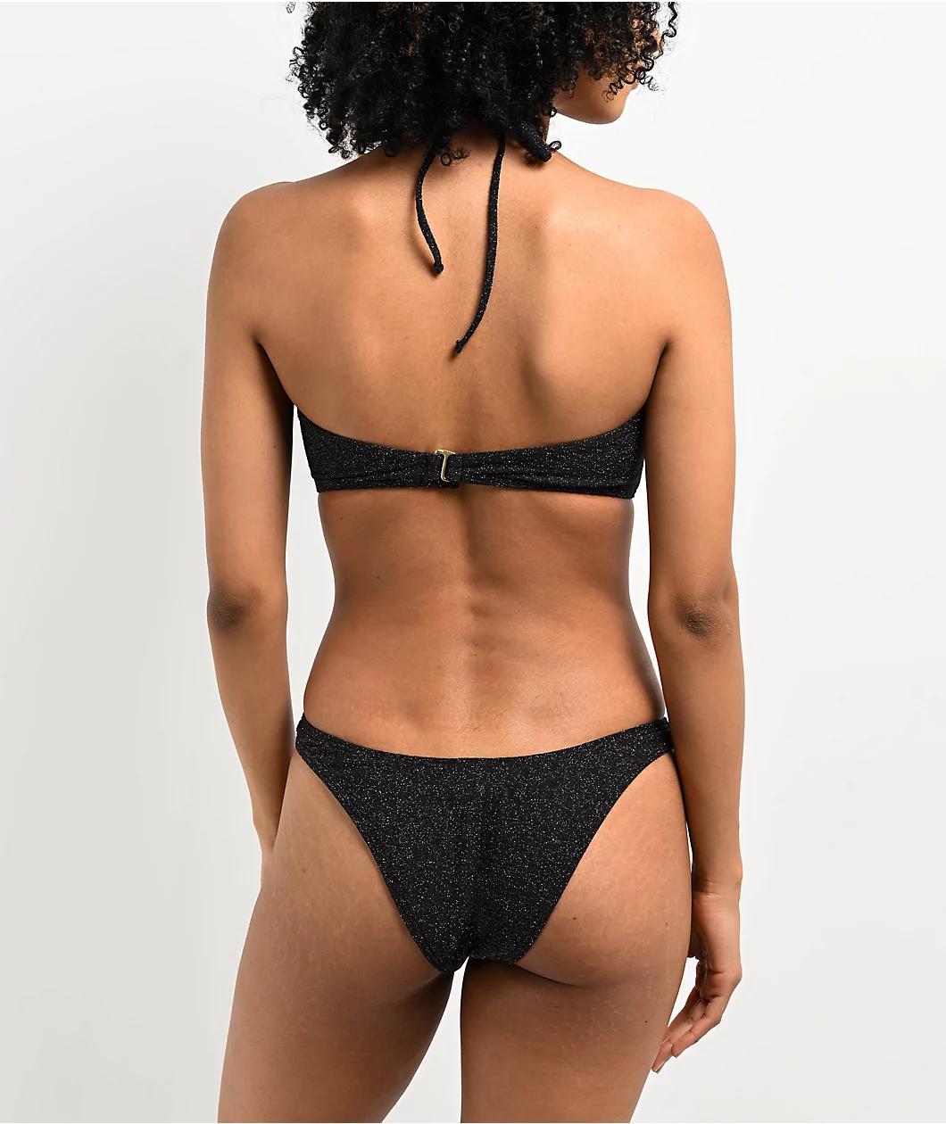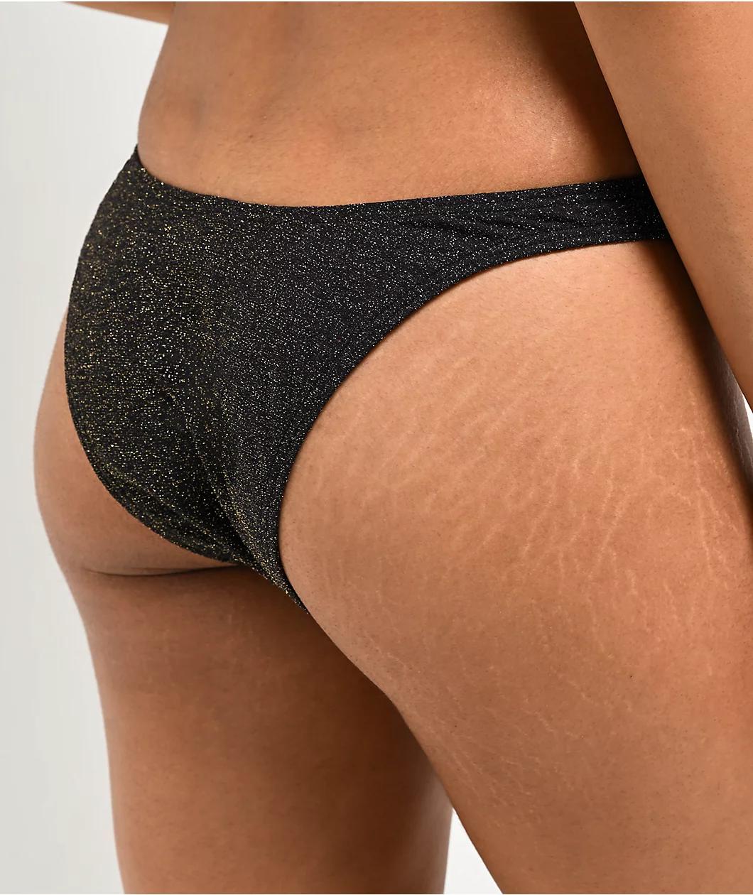 Offered by Damsel, the Jules Crinkle Dust bikini bottom has arrived in black boasting sparkly gold detailing throughout and a high leg silhouette that compliments leg length.