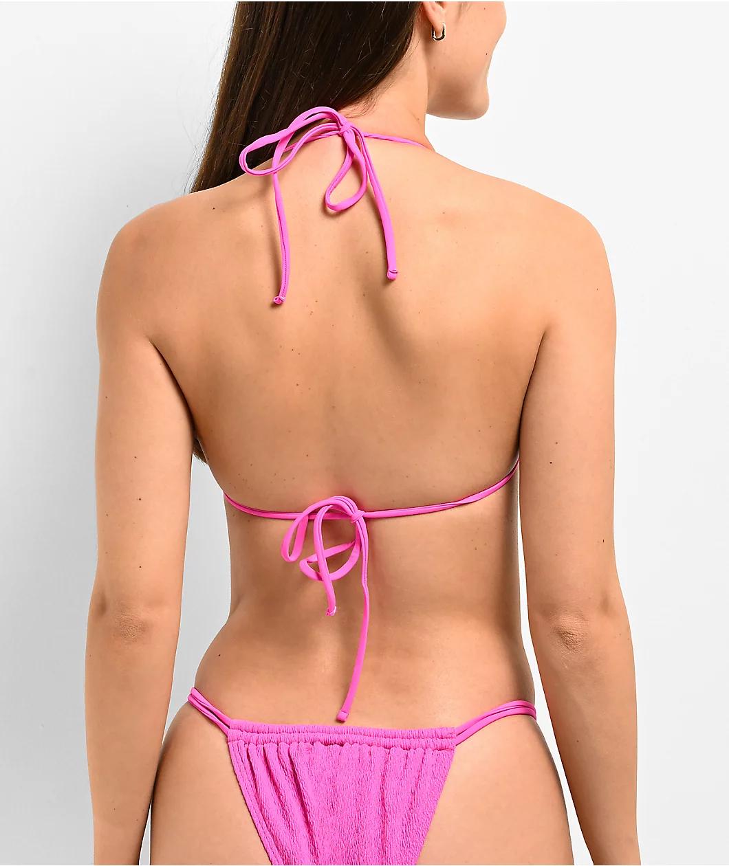 Damsel introduces the Mila Smocked triangle bikini top in a vibrant hot pink color. It features adjustable shoulder straps for a custom fit and removable padding for moderate support. This swim top offers both stretch and durability, and adds a