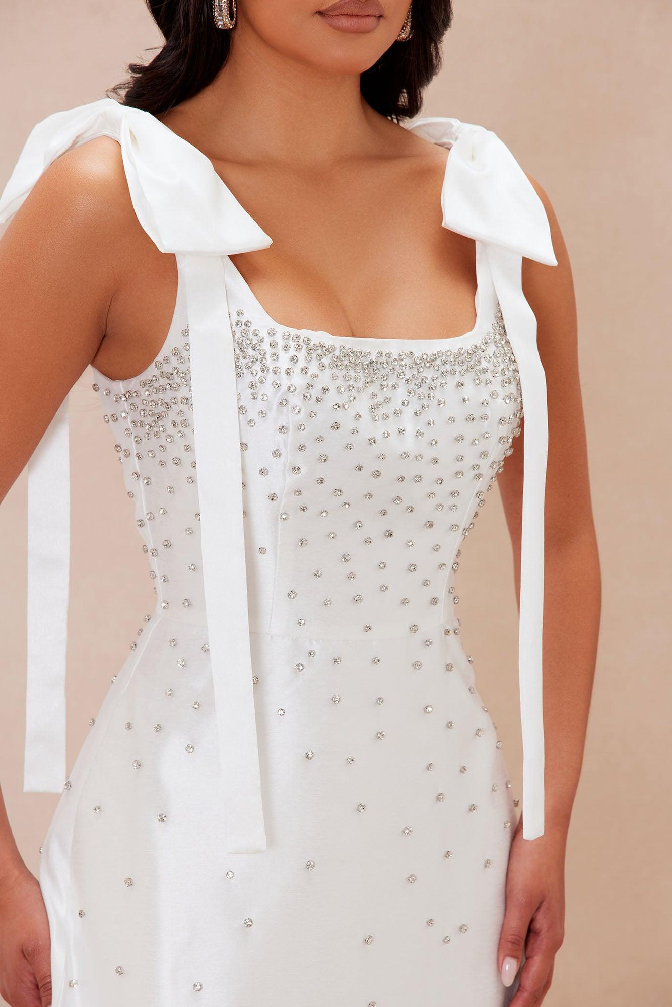 Available In Black And White. Satin Maxi Dress Square Neckline Sleeveless Embellished Bows Back Zipper Closure Lined No Stretch Length= 60.5'' Shell: 100% Polyester Lining: 100% Polyester Imported