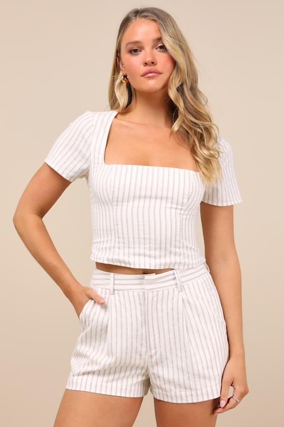 Chic tailoring and a linen-like fabrication create these must-have striped shorts that are ready to jet set whenever you are. The figure-skimming silhouette features a high-rise fit, belt loops, and a top clasp closure above a hidden zip-fly. Functional front pockets and back welt pockets complete the look. Pair with the matching top for a complete look!
