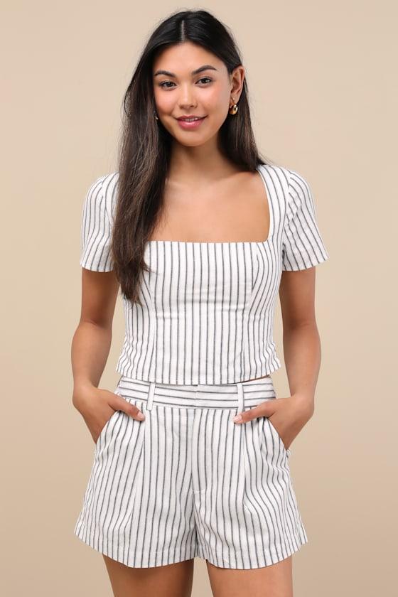 Chic tailoring and a linen-like fabrication create these must-have striped shorts that are ready to jet set whenever you are. The figure-skimming silhouette features a high-rise fit, belt loops, and a top clasp closure above a hidden zip-fly. Functional front pockets and back welt pockets complete the look. Pair with the matching top for a complete look!