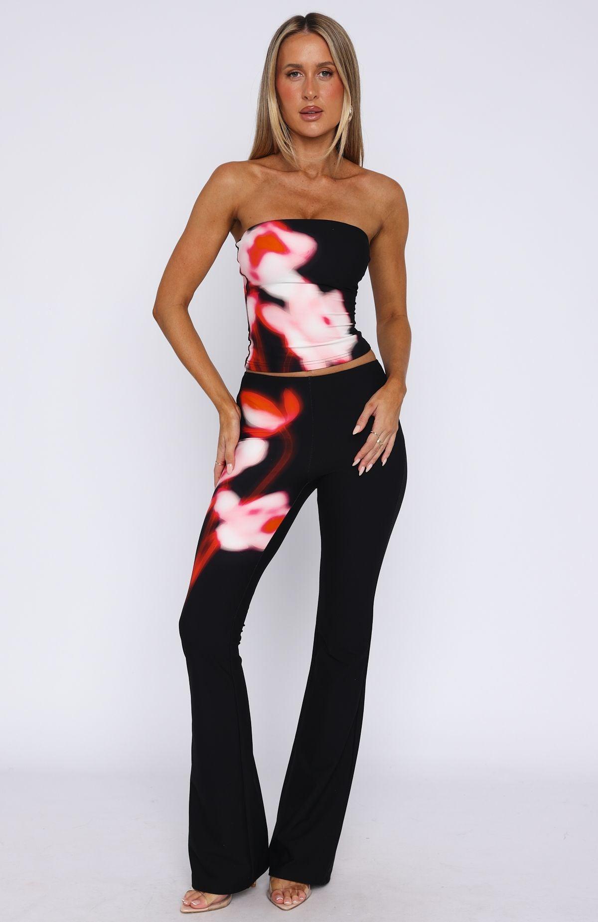The Dance To My Rhythm Pants in Onyx Burst is crafted for nights under the stars! Features a thin elasticated waistband, blurred floral graphic design on leg and flare design. Complete the look with the matching Dance To My Rhythm Strapless Top in Onyx Burst for a look we love. 80% Nylon 20% Spandex Ash is 166cm & wears an XS Em is 170cm & wears an XS