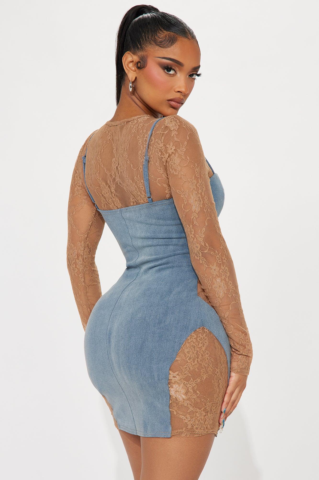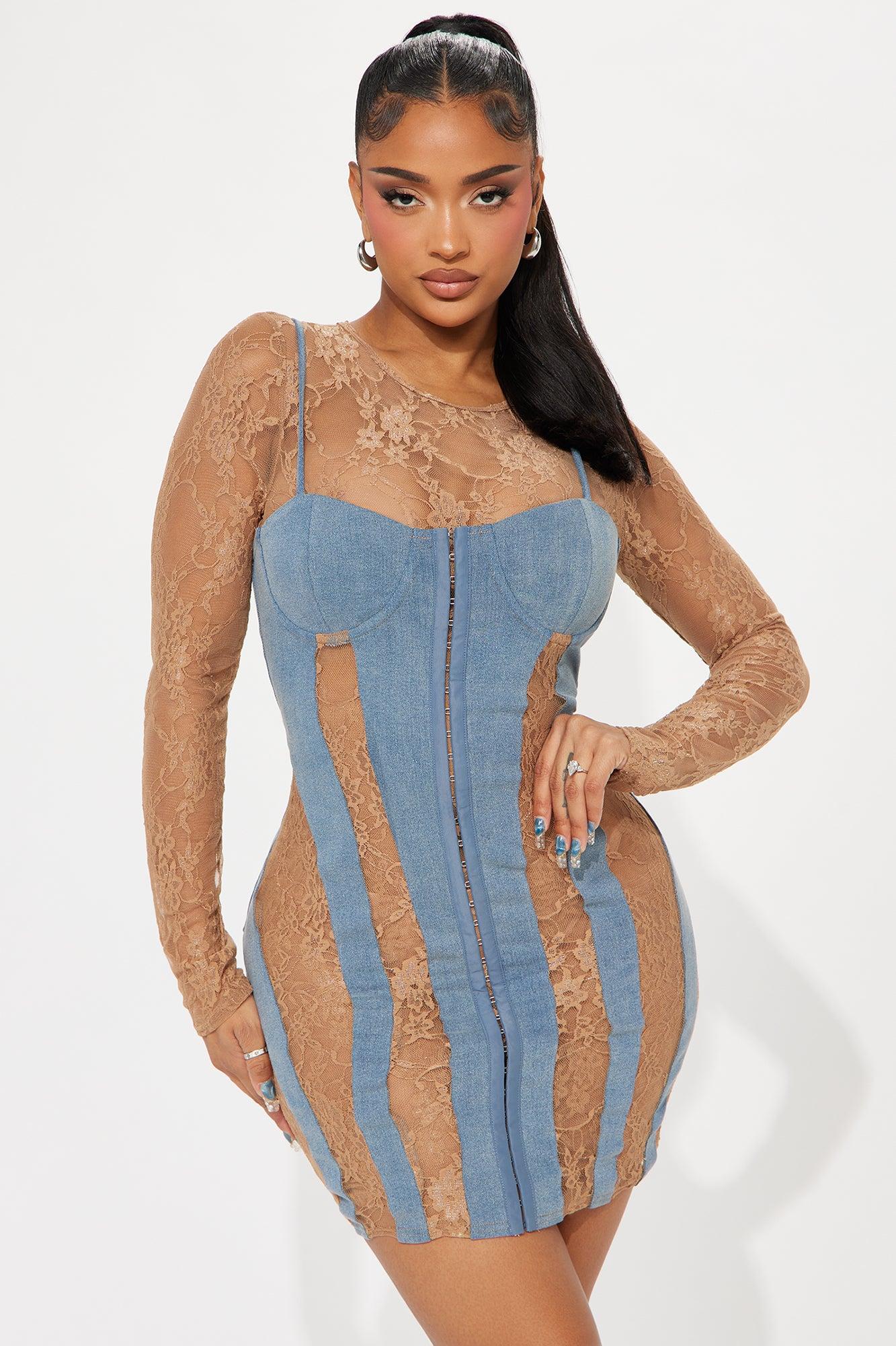 Available In Denim. Denim Mini Dress High neckline Long sleeves Lace cut outs Adjustable straps Bra cups w/ underwire Hook & eye front closure Stretch Length = 33" Self: 75% Cotton 23% Polyester 2% Spandex Contrast: 90% Nylon 10% Spandex Imported California Proposition 65 WARNING: Cancer and Reproductive Harm - www.P65Warnings.ca.gov.
