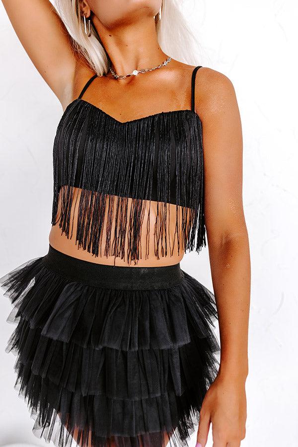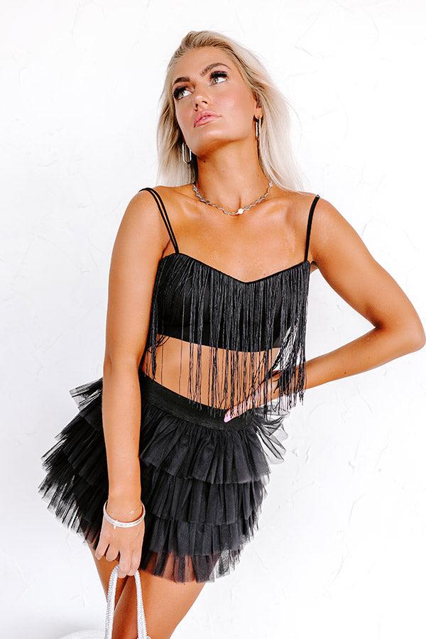 – Get ready for a fun night out in our stunning top – Lightweight, soft and fully lined material with front fringe detail – Flirty sweetheart neckline and a straight back with a zip closure – Double elastic spaghetti straps – Flattering figure hugging silhouette that ends in a straight hemline