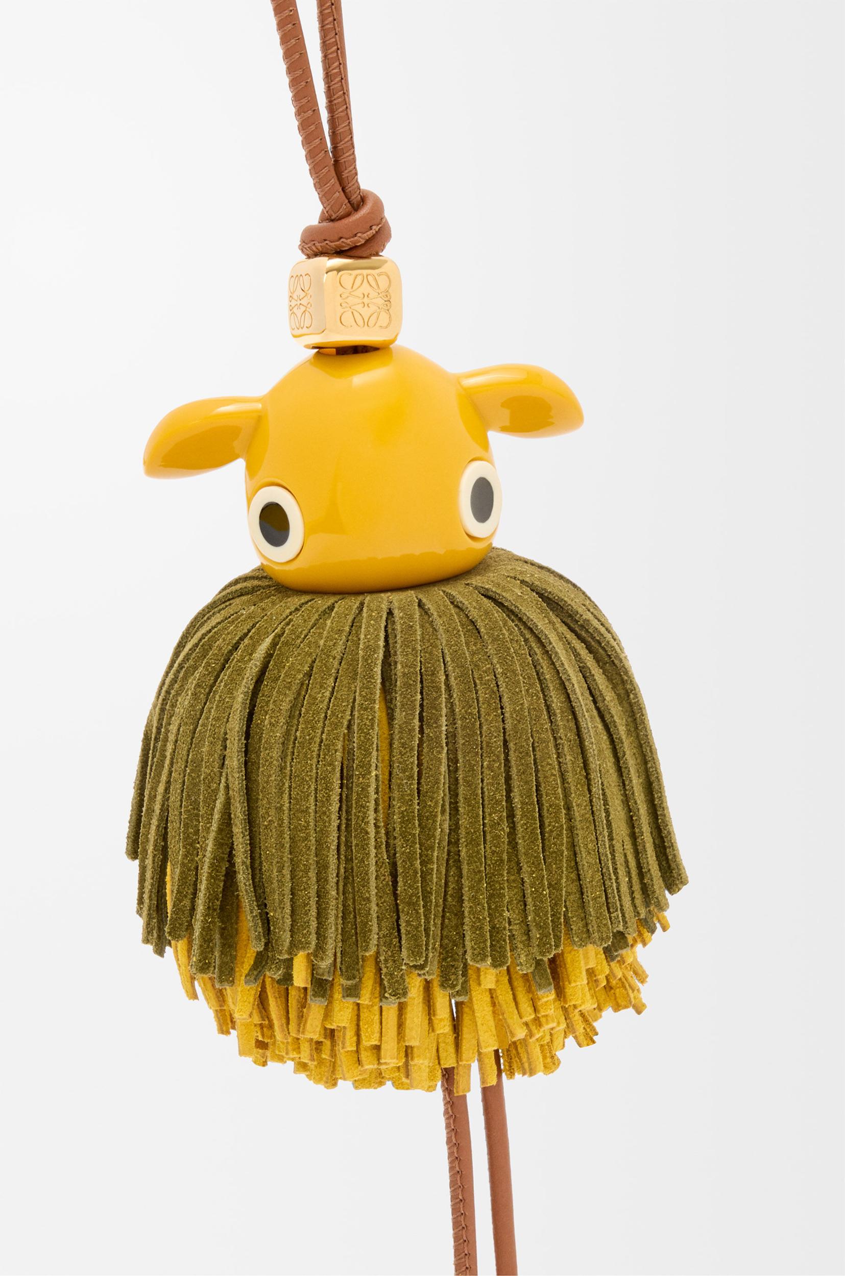 Charm in calfskin and acetate with a looped calfskin strap and an Anagram dice. Inspired by the Puzzle 10 William de Morgan re-edition bag as part of the Puzzle 10th Anniversary collection. *Engraved Anagram
