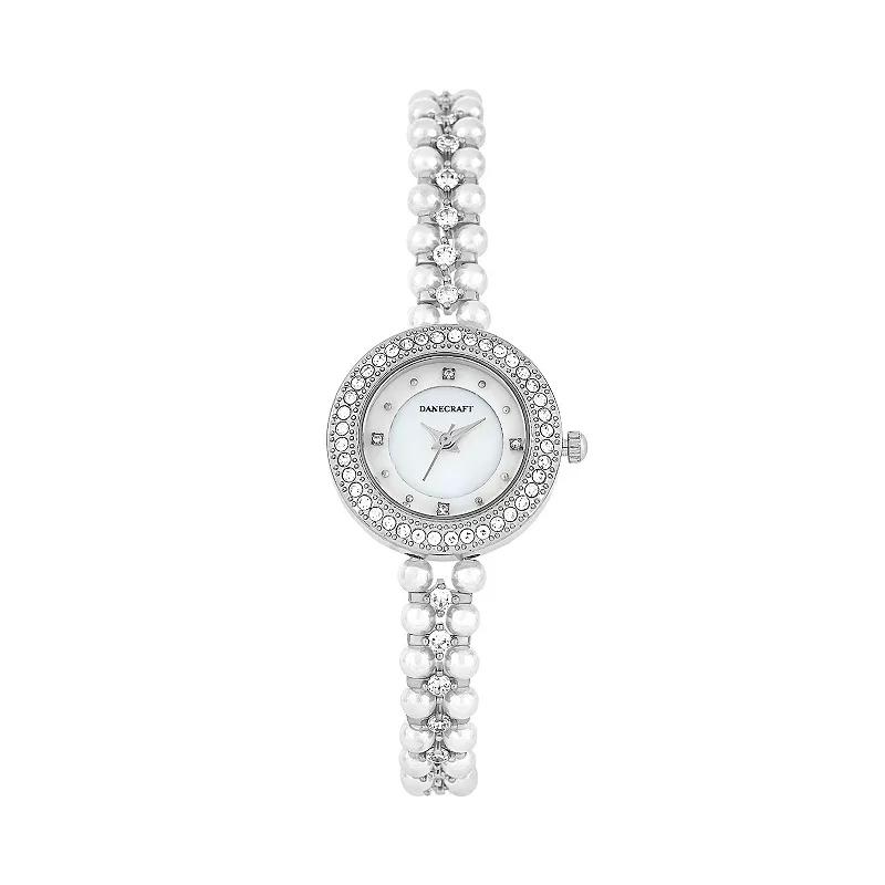 This elegant silver-plated womens watch has a crystal stone bezel and a pearl-crystal band for added glamour. Click on this JEWELRY & WATCHES GUIDE to learn about fit, styles, materials and more!This elegant silver-plated womens watch has a crystal stone bezel and a pearl-crystal band for added glamour. Click on this JEWELRY & WATCHES GUIDE to learn about fit, styles, materials and more!FEATURES Crystal accents Stone type: simulated crystalDISPLAY Dial type: matte Face cover material: glassCASE Material: metal alloy Caseback material: metal alloy Diameter: 25 mmBAND Band type: link bracelet Material: metal alloy Clasp: fold-over deployment Band length: 160-195 mmDETAILS Movement: quartz Power: battery Water resistance: splash-proof Packaging: boxed ImportedSETUP INFORMATION Style: casual Warning: Cancer and Reproductive Harm. For more information go to . Size: 25MM. Color: Silver Tone White. Gender: female. Age Group: adult.