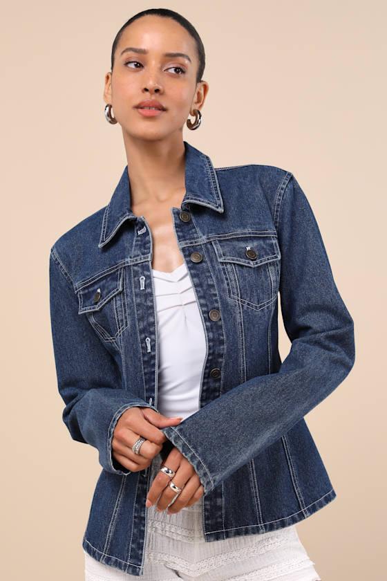 A classic layering piece like this fitted denim jacket is exactly what you need to achieve cool girl status any day of the week. Long sleeves frame a collared neckline and a figure-accentuating bodice with flattering seam detailing, button patch pockets, and a button placket along the center.