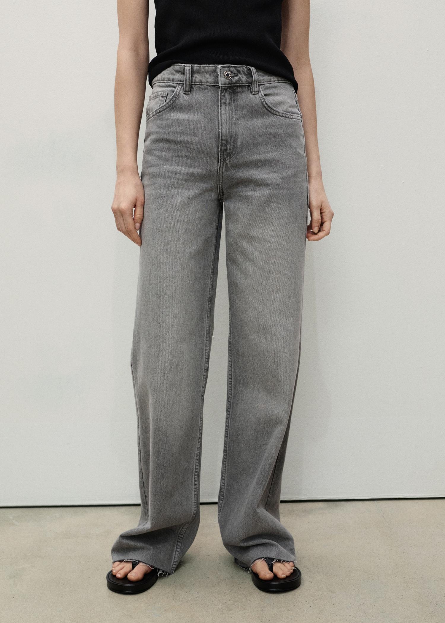 Denim style cotton fabric. Wide-leg design. Long design. Wide leg. High waist. Loops. Five pockets. Frayed finish. Front zipper and button closure. Inside length 84.5 cm. The model is 1.79 tall and is wearing a size 36. Inside leg measurement 33.54 in. Side length 45.47 in