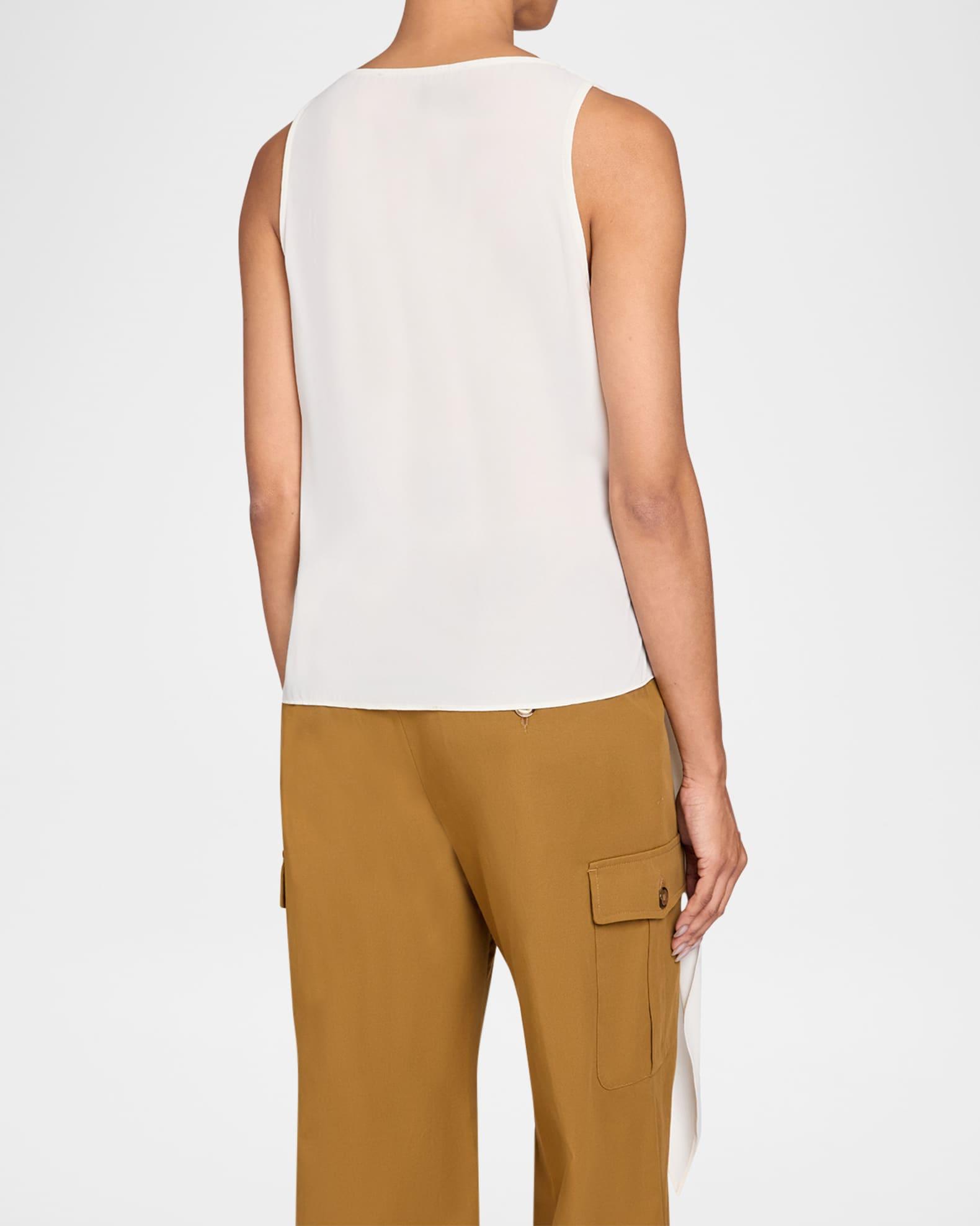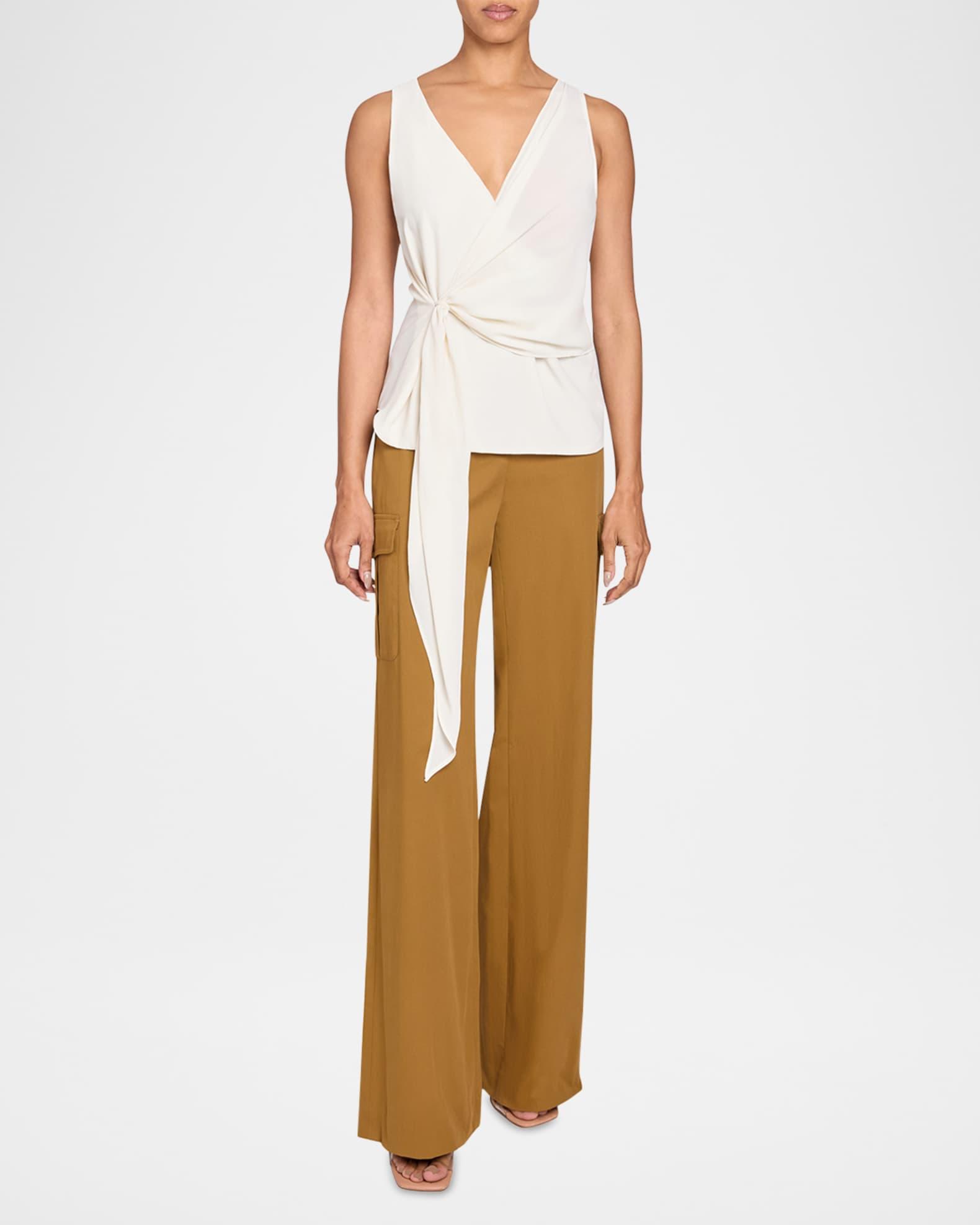 Santorelli "Danna" fluid crepe top wraps in the front with a gathered loop overlap Approx. 23"L from shoulders to hem Surplice neckline Sleeveless Slim fit Polyester Unlined Dry clean Made in Italy