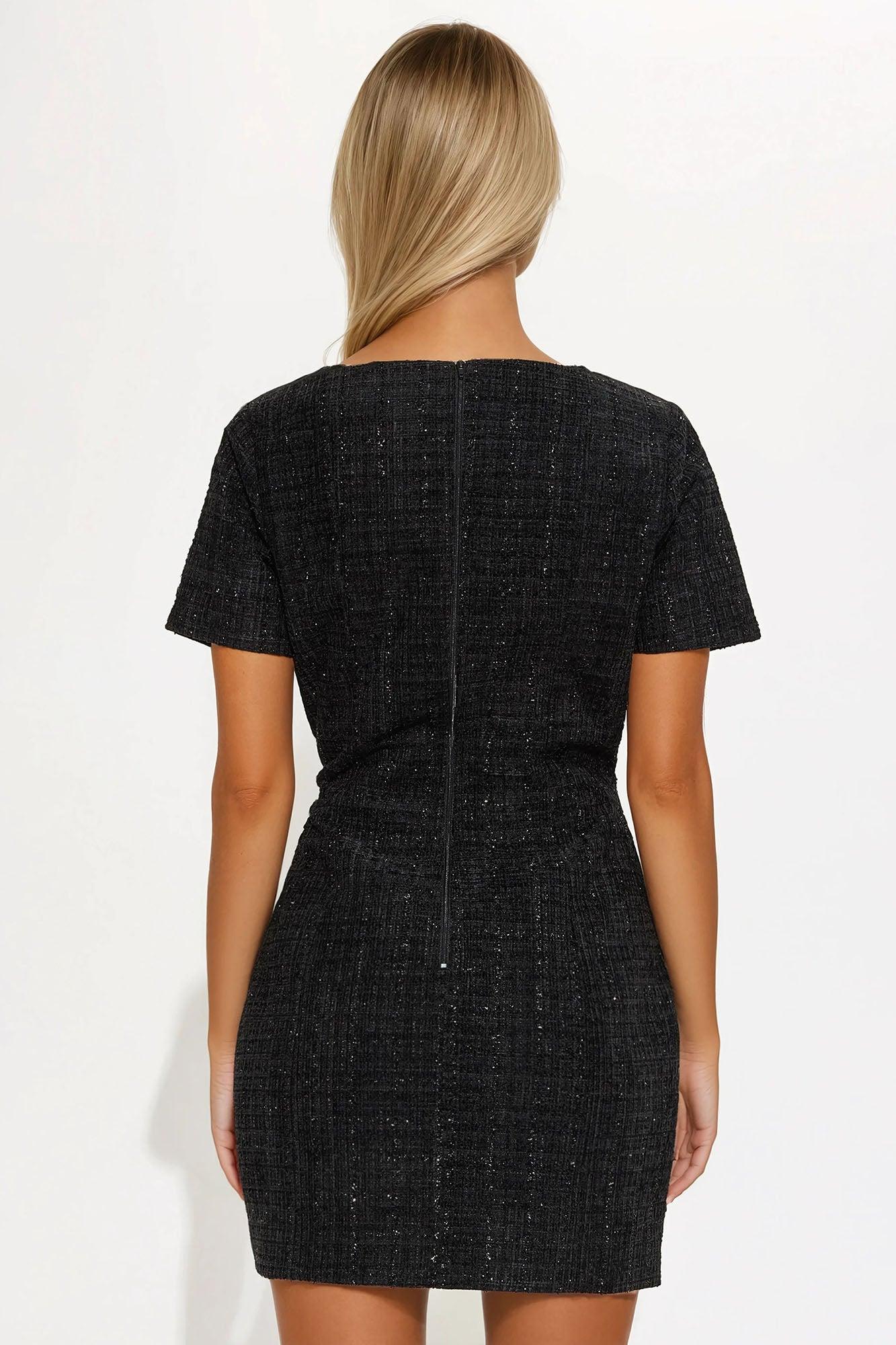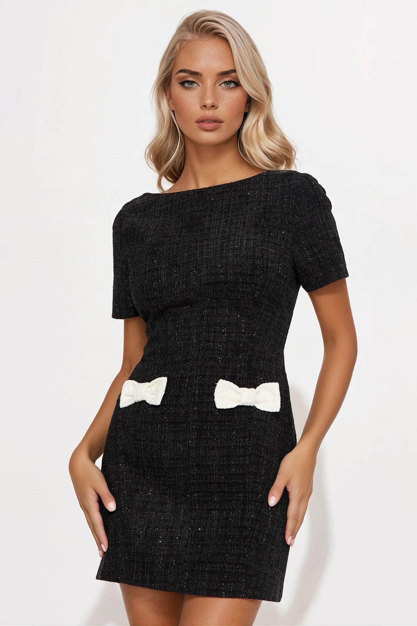 Available In Black And Hot Pink. Tweed Micro Mini Dress Boat neckline Short sleeves Bow detail Back zipper Lined Length measured flat = 33" Self / Lining: 100% Polyester Imported California Proposition 65WARNING: Cancer and Reproductive Harm - www.P65Warnings.ca.gov.