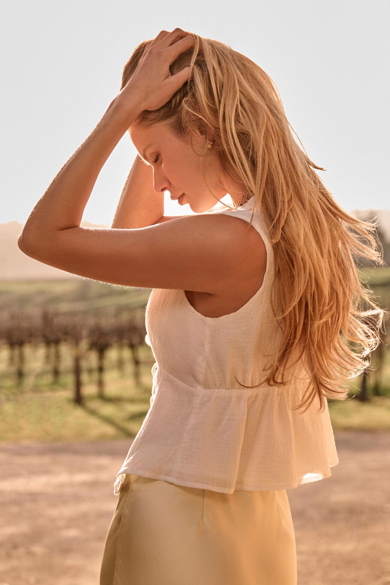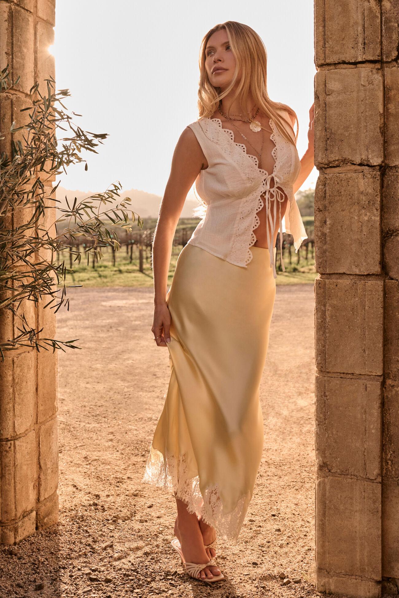 This tank top is a sweet and charming essential for warm weather, blending delicate detail with effortless wear. Featuring beautiful, intricate crochet trim along the edges, it is finished with a playful tie-front detail for a relaxed, feminine look.